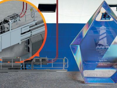 Com a sua tomada de energia móvel a partir de terra (iMSPO), a igus desenvolveu um sistema móvel para fornecimento de energia para terminais portuários, que pode ser movimentado de forma flexível, dependendo da posição dos navios no cais. O sistema permite aos navios desligarem os motores nos terminais portuários e utilizarem a energia elétrica de terra, que é mais ecológica, reduzindo significativamente as emissões de CO2. Pela sua solução inovadora para possibilitar operações portuárias flexíveis e sustentáveis, a igus foi agora distinguida com a “Inovação Marítima do Ano”. O prémio foi entregue durante a conferência da Associação Americana de Autoridades Portuárias (AAPA) no Quebeque, Canadá.