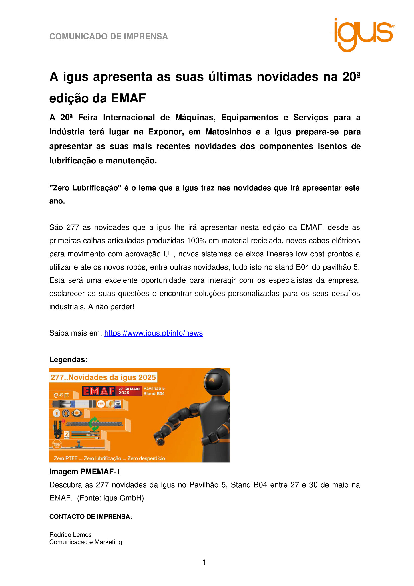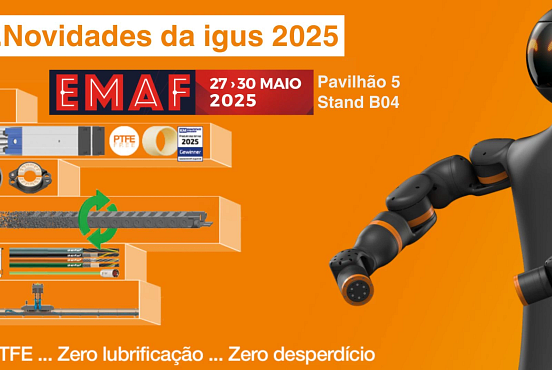 São 277 as novidades que a igus lhe irá apresentar nesta edição da EMAF, desde as primeiras calhas articuladas produzidas 100% em material reciclado, novos cabos elétricos para movimento com aprovação UL, novos sistemas de eixos lineares low cost prontos a utilizar e até os novos robôs, entre outras novidades, tudo isto no stand B04 do pavilhão 5. Esta será uma excelente oportunidade para interagir com os especialistas da empresa, esclarecer as suas questões e encontrar soluções personalizadas para os seus desafios industriais. A não perder!