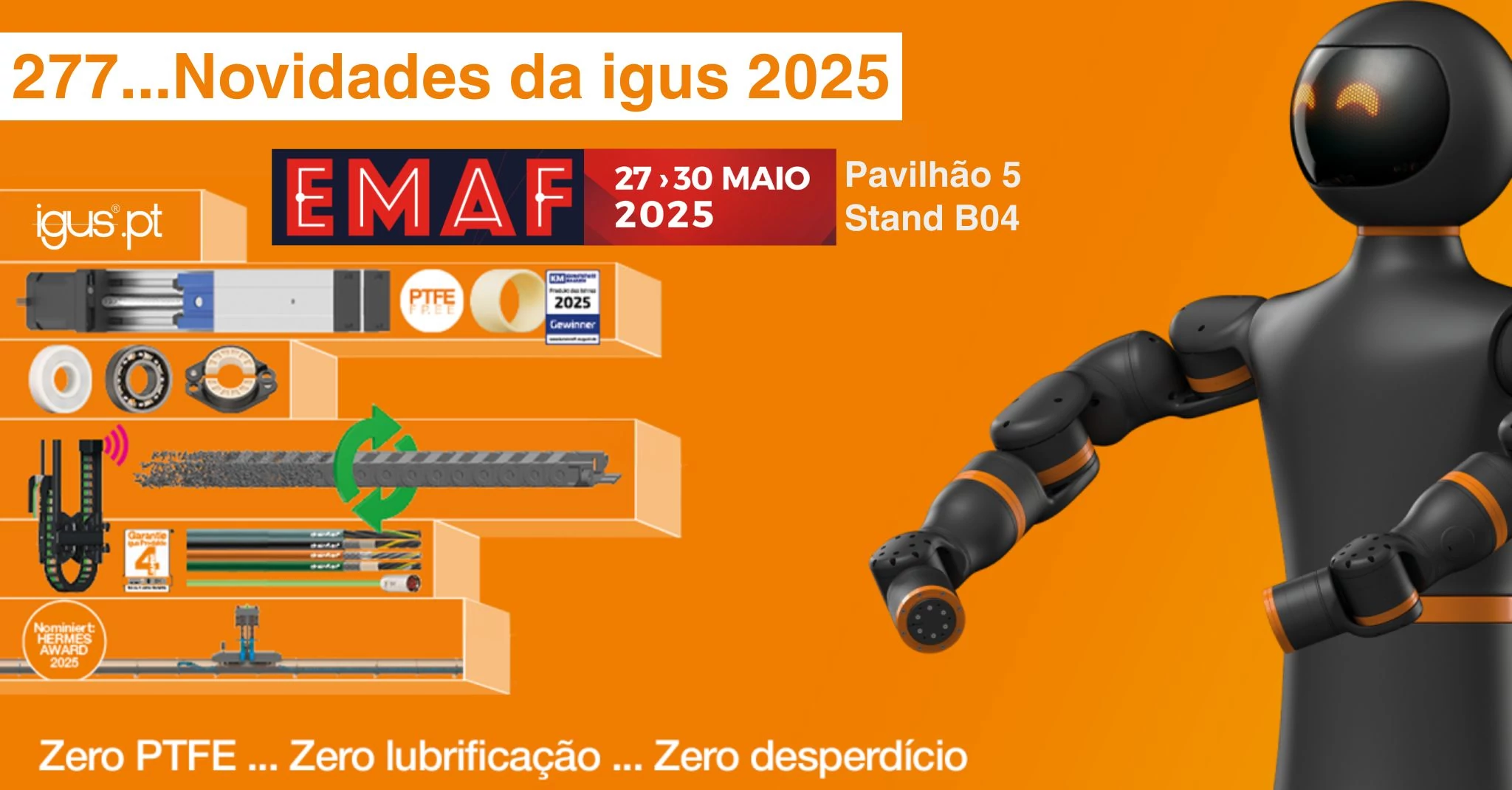 São 277 as novidades que a igus lhe irá apresentar nesta edição da EMAF, desde as primeiras calhas articuladas produzidas 100% em material reciclado, novos cabos elétricos para movimento com aprovação UL, novos sistemas de eixos lineares low cost prontos a utilizar e até os novos robôs, entre outras novidades, tudo isto no stand B04 do pavilhão 5. Esta será uma excelente oportunidade para interagir com os especialistas da empresa, esclarecer as suas questões e encontrar soluções personalizadas para os seus desafios industriais. A não perder!