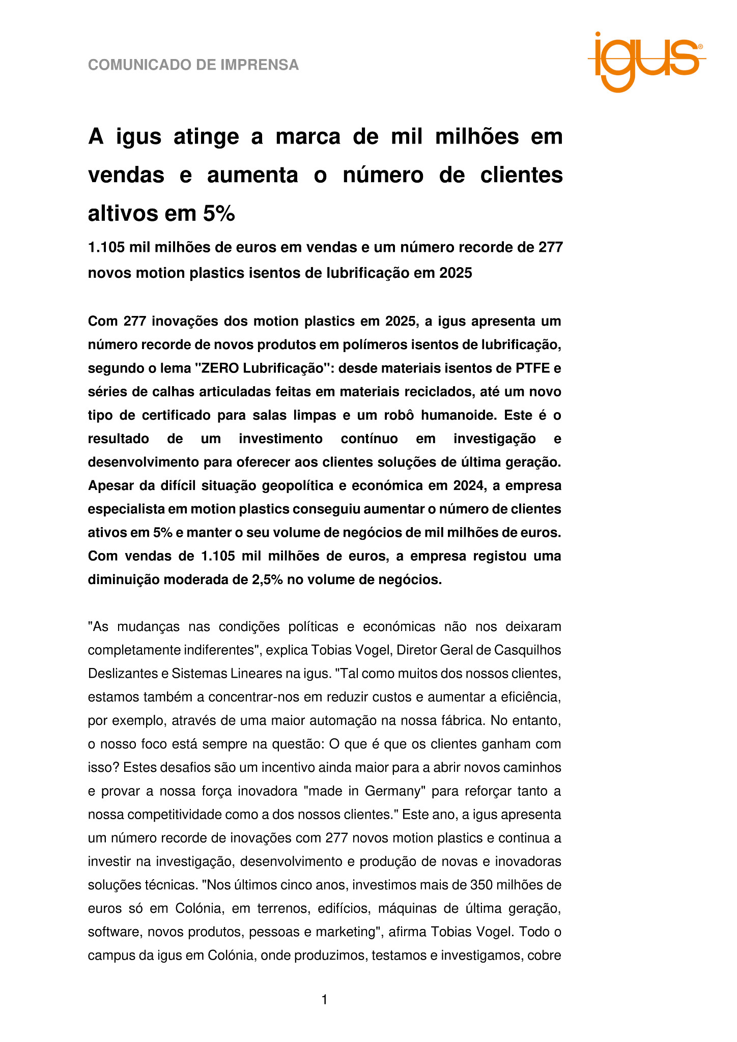 Com 277 inovações dos motion plastics em 2025, a igus apresenta um número recorde de novos produtos em polímeros isentos de lubrificação, segundo o lema “ZERO Lubrificação”: desde materiais isentos de PTFE e séries de calhas articuladas feitas em materiais reciclados, até um novo tipo de certificado para salas limpas e um robô humanoide. Este é o resultado de um investimento contínuo em investigação e desenvolvimento para oferecer aos clientes soluções de última geração. Apesar da difícil situação geopolítica e económica em 2024, a empresa especialista em motion plastics conseguiu aumentar o número de clientes ativos em 5% e manter o seu volume de negócios de mil milhões de euros. Com vendas de 1.105 mil milhões de euros, a empresa registou uma diminuição moderada de 2,5% no volume de negócios.