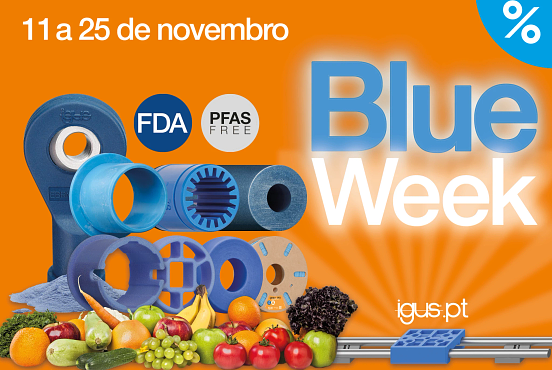 A igus Portugal acaba de anunciar a “Blue Week”, entre o dia 11 e 25 de novembro. Durante este período, clientes e futuros clientes da indústria alimentar terão acesso exclusivo a ofertas em produtos de várias gamas, incluindo casquilhos deslizantes em polímeros isentos de lubrificação, rodas dentadas, chumaceiras e calotas esféricas, calhas articuladas, entre outros.