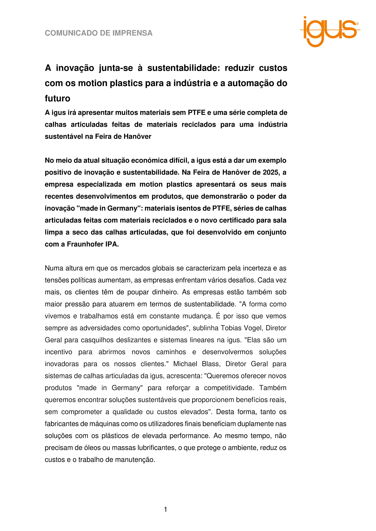 Numa altura em que os mercados globais se caracterizam pela incerteza e as tensões políticas aumentam, as empresas enfrentam vários desafios. Cada vez mais, os clientes têm de poupar dinheiro. As empresas estão também sob maior pressão para atuarem em termos de sustentabilidade. “A forma como vivemos e trabalhamos está em constante mudança. É por isso que vemos sempre as adversidades como oportunidades”, sublinha Tobias Vogel, Diretor Geral para casquilhos deslizantes e sistemas lineares na igus. “Elas são um incentivo para abrirmos novos caminhos e desenvolvermos soluções inovadoras para os nossos clientes.” Michael Blass, Diretor Geral para sistemas de calhas articuladas da igus, acrescenta: “Queremos oferecer novos produtos “made in Germany” para reforçar a competitividade. Também queremos encontrar soluções sustentáveis que proporcionem benefícios reais, sem comprometer a qualidade ou custos elevados”. Desta forma, tanto os fabricantes de máquinas como os utilizadores finais beneficiam duplamente nas soluções com os plásticos de elevada performance. Ao mesmo tempo, não precisam de óleos ou massas lubrificantes, o que protege o ambiente, reduz os custos e o trabalho de manutenção.