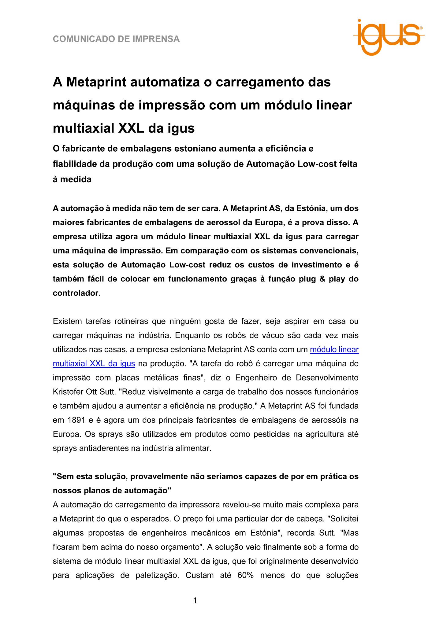 A automação à medida não tem de ser cara. A Metaprint AS, da Estónia, um dos maiores fabricantes de embalagens de aerossol da Europa, é a prova disso. A empresa utiliza agora um módulo linear multiaxial XXL da igus para carregar uma máquina de impressão. Em comparação com os sistemas convencionais, esta solução de Automação Low-cost reduz os custos de investimento e é também fácil de colocar em funcionamento graças à função plug & play do controlador.