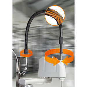 A solução de cabos SCARA consiste em três componentes: um casquilho rotativo para a extremidade móvel e para a extremidade fixa, bem como a mangueira corrugada com o e-rib. A característica especial reside na nova ligação rotativa, que absorve as forças de torção. Aqui, os rolamentos de esferas integrados, asseguram um sistema de fornecimento de energia com funcionamento suave e resistente mesmo com acelerações elevadas. A mangueira corrugada é reforçada com um e-rib de modo a poder mover-se apenas numa direção. Os elementos da guia dos lados dão à mangueira um adicional comprimento não suportado.