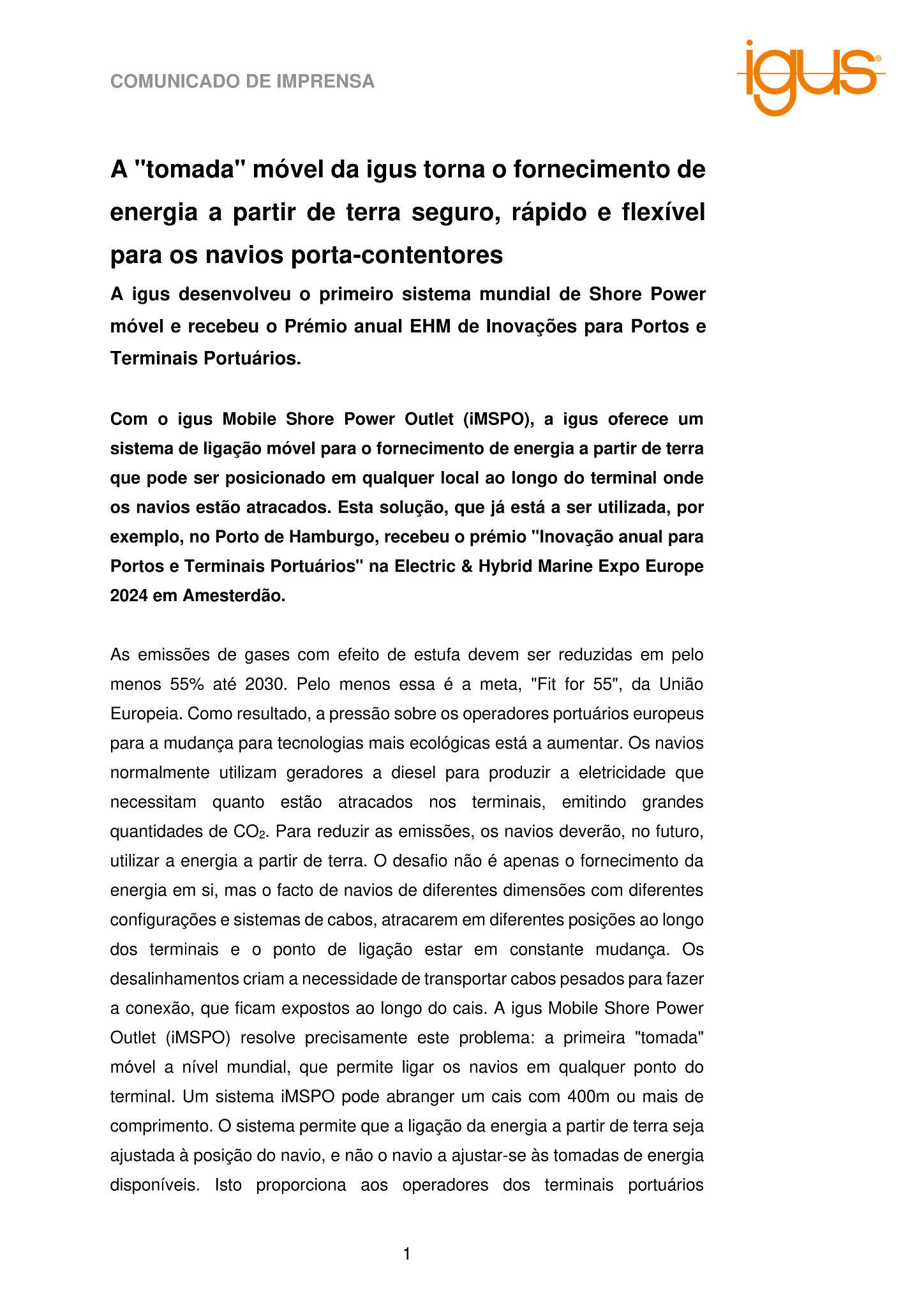 Com o igus Mobile Shore Power Outlet (iMSPO), a igus oferece um sistema de ligação móvel para o fornecimento de energia a partir de terra que pode ser posicionado em qualquer local ao longo do terminal onde os navios estão atracados. Esta solução, que já está a ser utilizada, por exemplo, no Porto de Hamburgo, recebeu o prémio “Inovação anual para Portos e Terminais Portuários” na Electric & Hybrid Marine Expo Europe 2024 em Amesterdão.