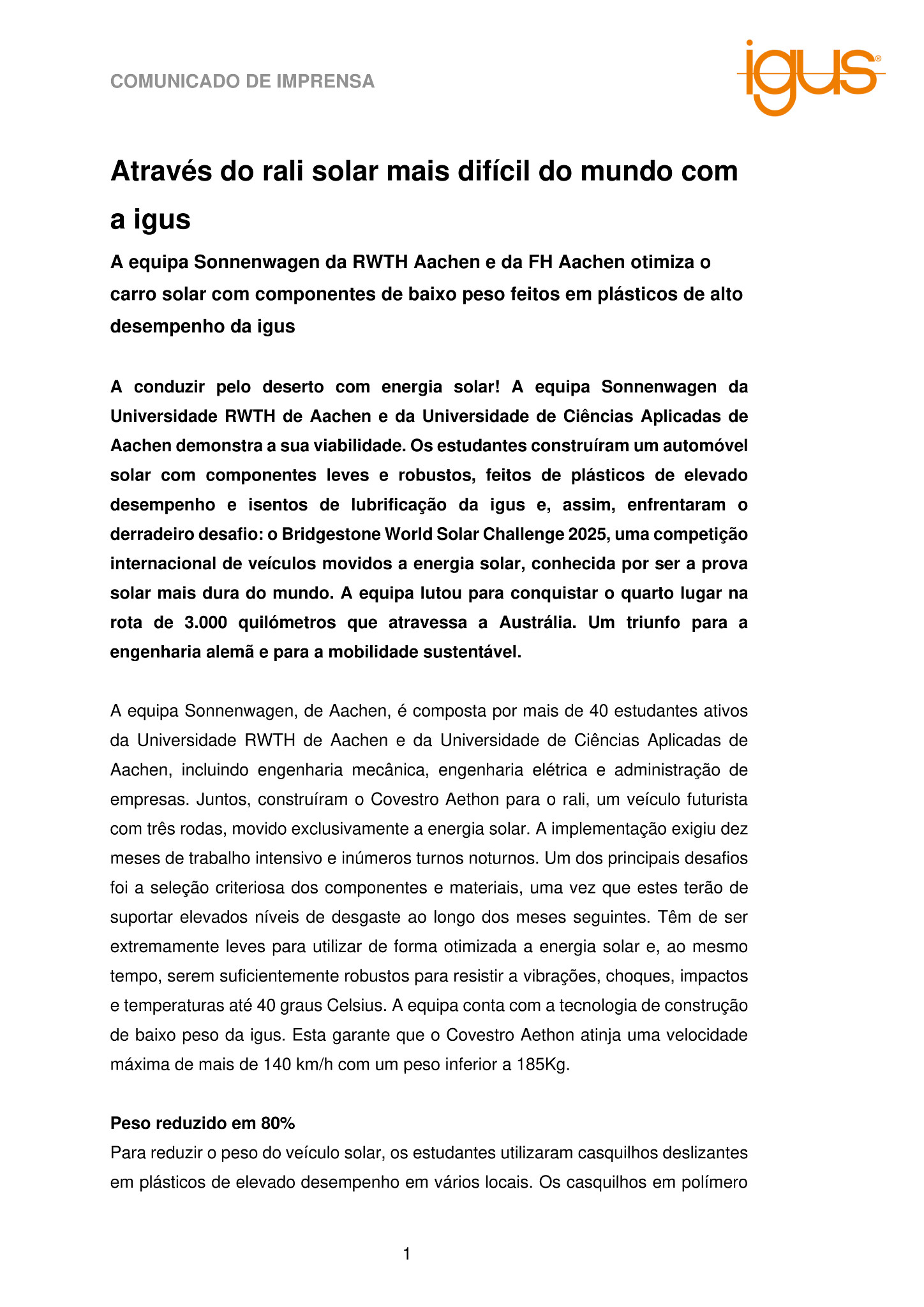 A conduzir pelo deserto com energia solar! A equipa Sonnenwagen da Universidade RWTH de Aachen e da Universidade de Ciências Aplicadas de Aachen demonstra a sua viabilidade. Os estudantes construíram um automóvel solar com componentes leves e robustos, feitos de plásticos de elevado desempenho e isentos de lubrificação da igus e, assim, enfrentaram o derradeiro desafio: o Bridgestone World Solar Challenge 2025, uma competição internacional de veículos movidos a energia solar, conhecida por ser a prova solar mais dura do mundo. A equipa lutou para conquistar o quarto lugar na rota de 3.000 quilómetros que atravessa a Austrália. Um triunfo para a engenharia alemã e para a mobilidade sustentável.