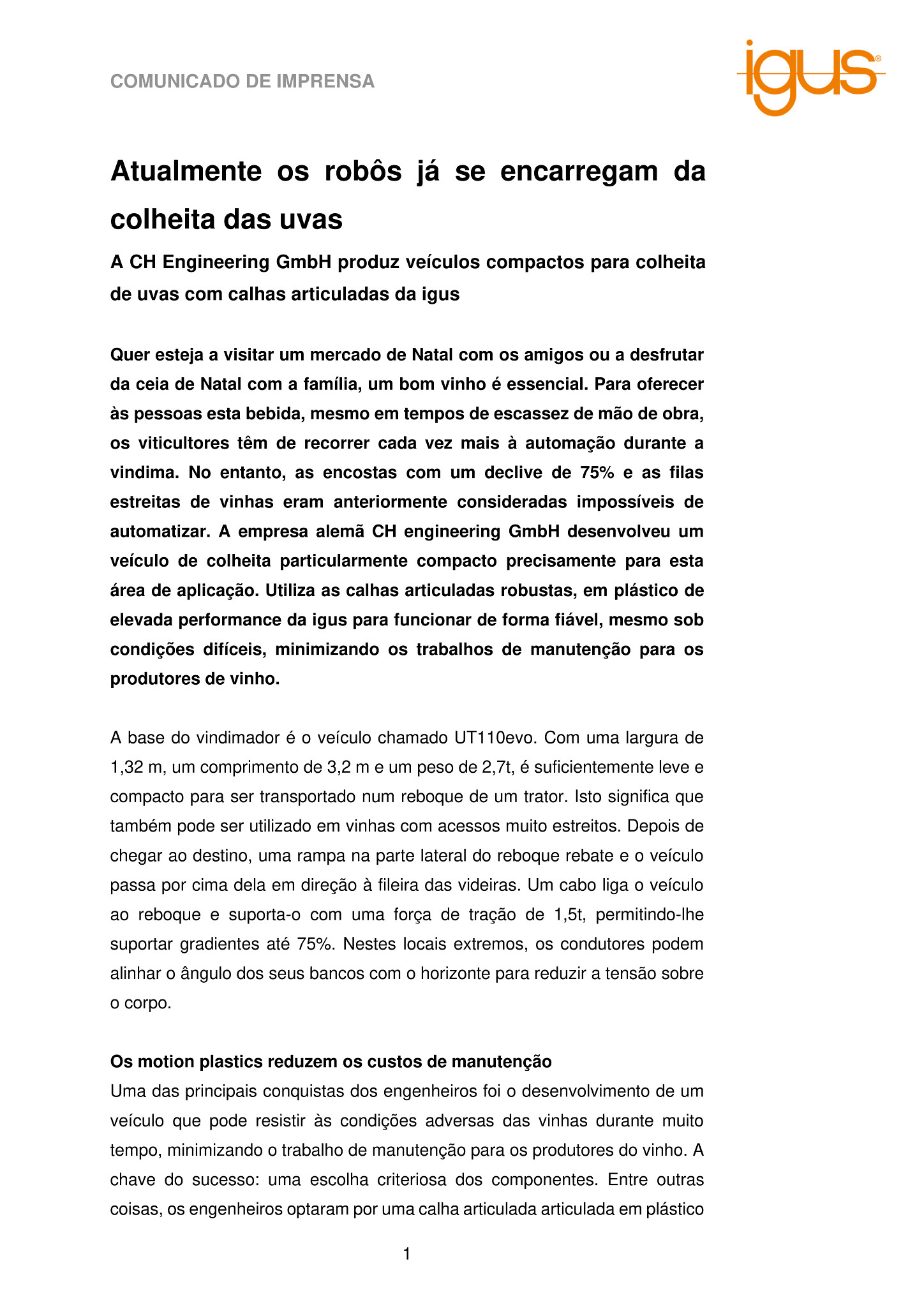 Quer esteja a visitar um mercado de Natal com os amigos ou a desfrutar da ceia de Natal com a família, um bom vinho é essencial. Para oferecer às pessoas esta bebida, mesmo em tempos de escassez de mão de obra, os viticultores têm de recorrer cada vez mais à automação durante a vindima. No entanto, as encostas com um declive de 75% e as filas estreitas de vinhas eram anteriormente consideradas impossíveis de automatizar. A empresa alemã CH engineering GmbH desenvolveu um veículo de colheita particularmente compacto precisamente para esta área de aplicação. Utiliza as calhas articuladas robustas, em plástico de elevada performance da igus para funcionar de forma fiável, mesmo sob condições difíceis, minimizando os trabalhos de manutenção para os produtores de vinho.