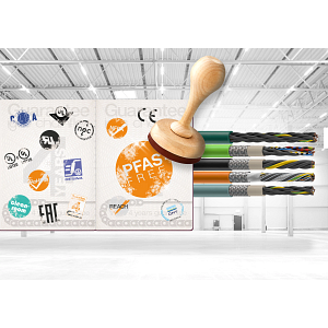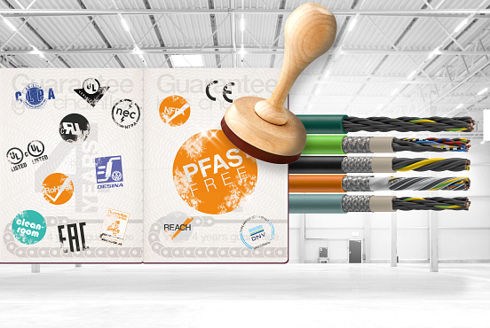 Os cabos chainflex não utilizam PTFE nem produtos químicos PFAS e têm a garantia do selo “isento de PFAS”