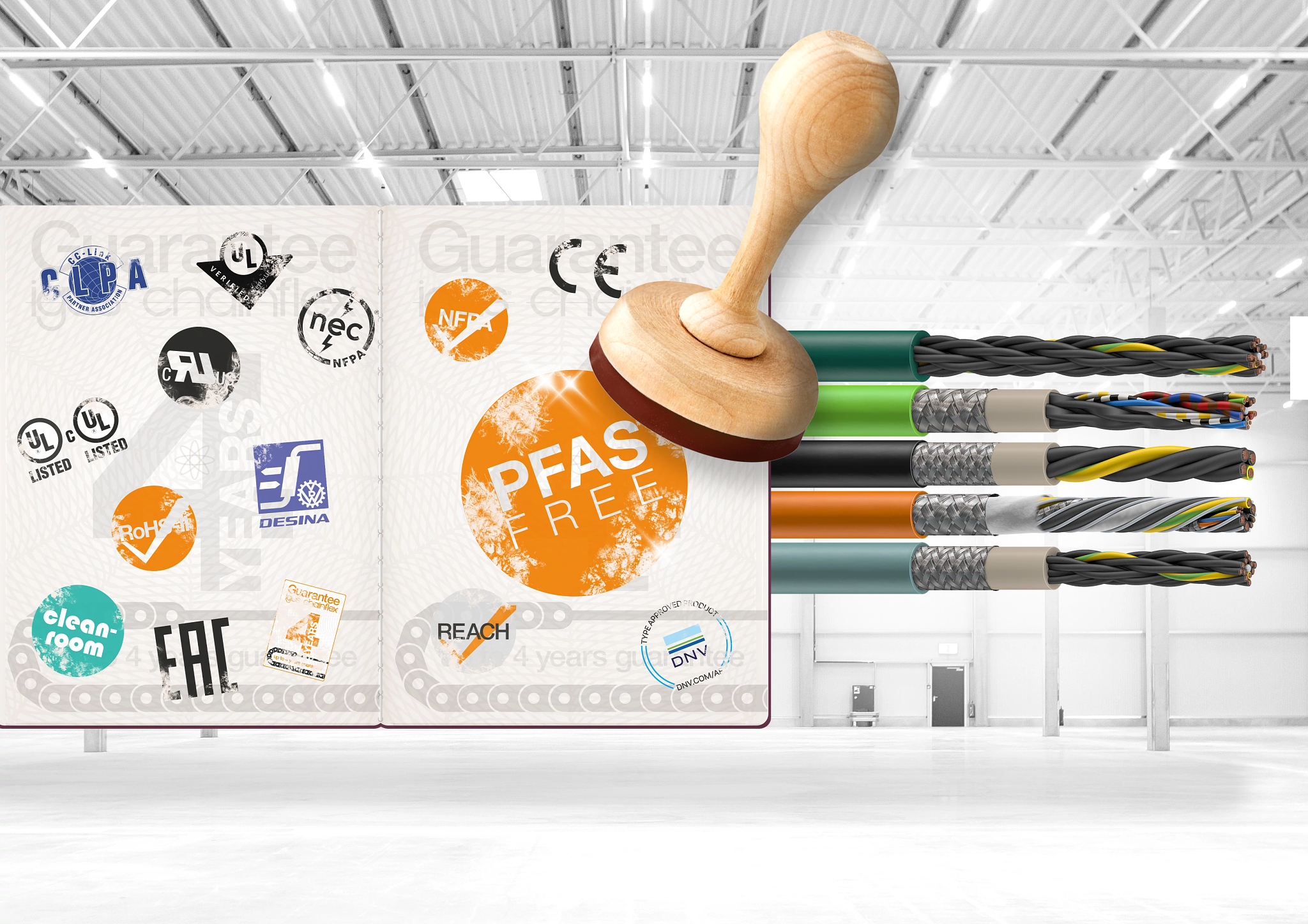 Os cabos chainflex não utilizam PTFE nem produtos químicos PFAS e têm a garantia do selo “isento de PFAS”