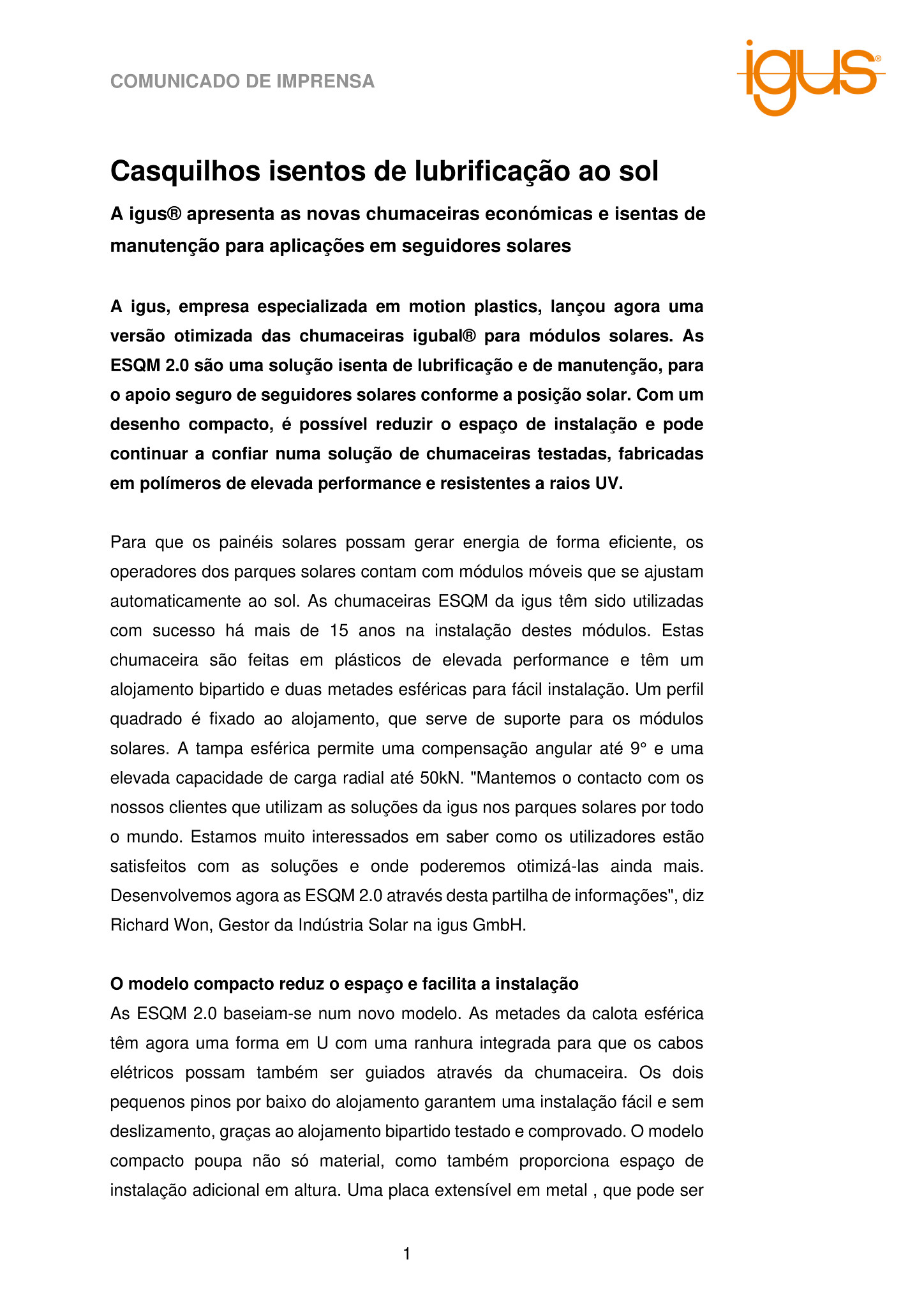 operadores dos parques solares contam com módulos móveis que se ajustam automaticamente ao sol. As chumaceiras ESQM da igus têm sido utilizadas com sucesso há mais de 15 anos na instalação destes módulos. Estas chumaceiras são feitas em plásticos de elevada performance e têm um alojamento bipartido e duas metades esféricas para fácil instalação. Um perfil quadrado é fixado ao alojamento, que serve de suporte para os módulos solares. A tampa esférica permite uma compensação angular até 9° e uma elevada capacidade de carga radial até 50kN. “Mantemos o contacto com os nossos clientes que utilizam as soluções da igus nos parques solares por todo o mundo. Estamos muito interessados em saber como os utilizadores estão