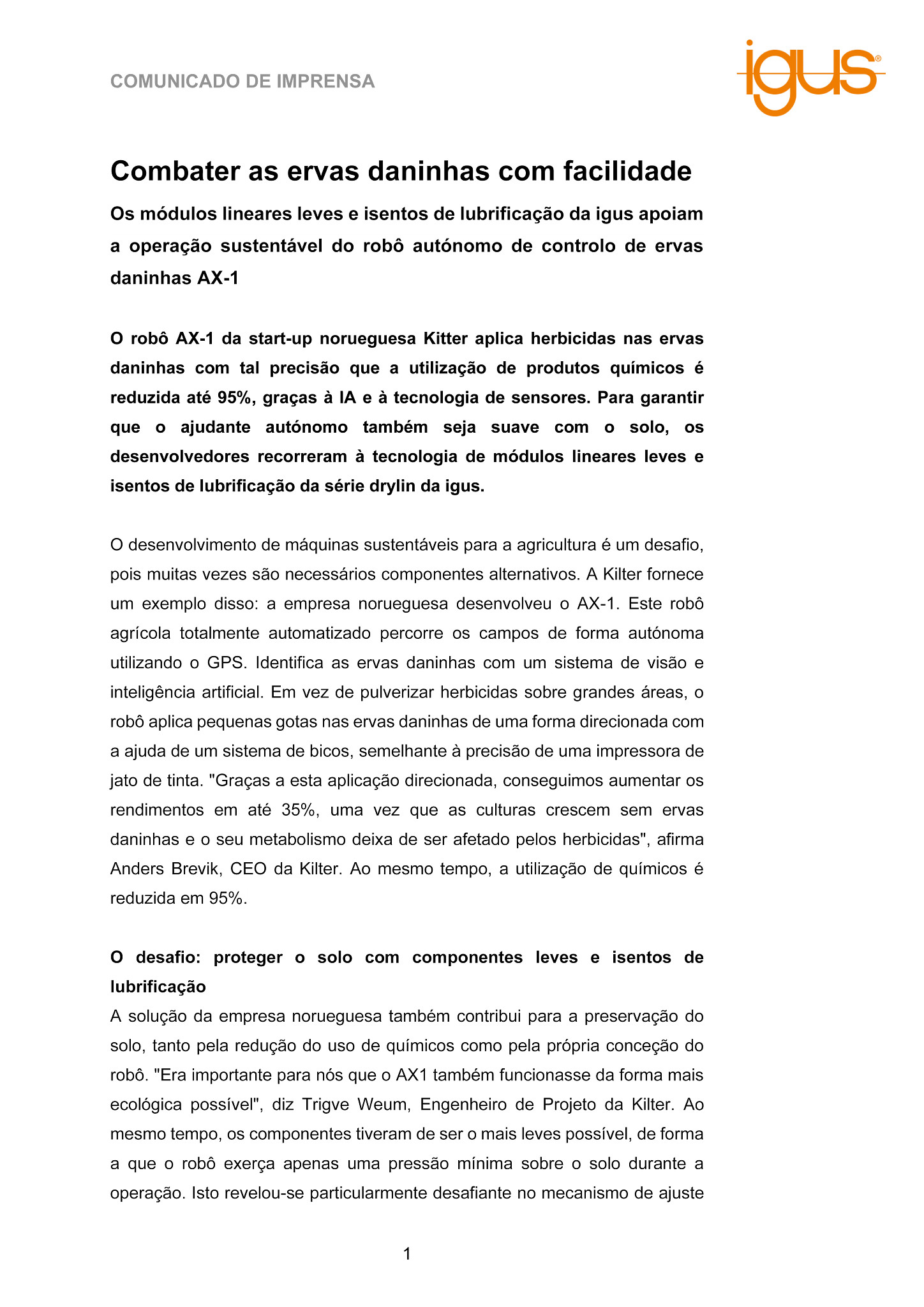 O robô AX-1 da start-up norueguesa Kitter aplica herbicidas nas ervas daninhas com tal precisão que a utilização de produtos químicos é reduzida até 95%, graças à IA e à tecnologia de sensores. Para garantir que o ajudante autónomo também seja suave com o solo, os desenvolvedores recorreram à tecnologia de módulos lineares leves e isentos de lubrificação da série drylin da igus.