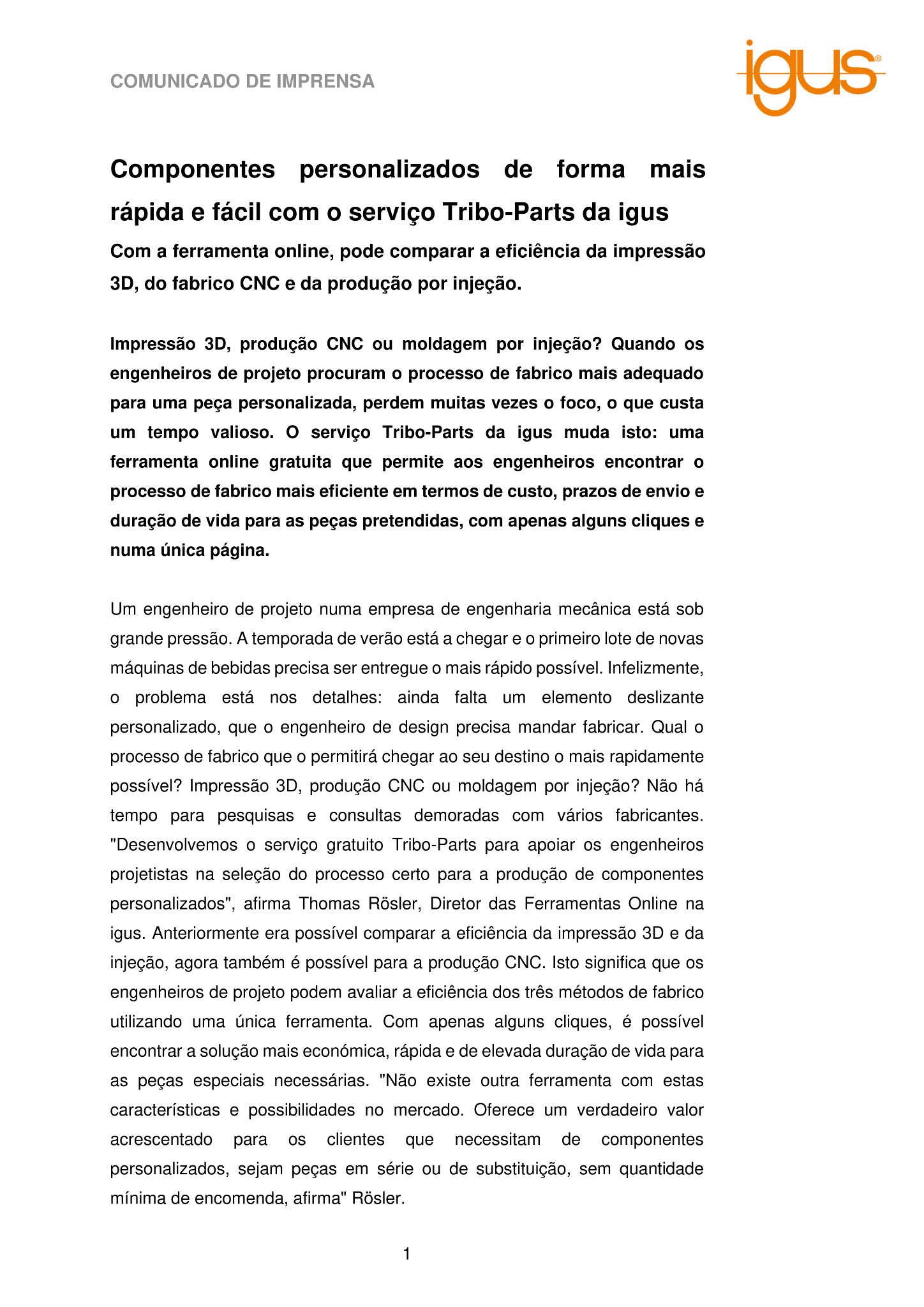 Um engenheiro de projeto numa empresa de engenharia mecânica está sob grande pressão. A temporada de verão está a chegar e o primeiro lote de novas máquinas de bebidas precisa ser entregue o mais rápido possível. Infelizmente, o problema está nos detalhes: ainda falta um elemento deslizante personalizado, que o engenheiro de design precisa mandar fabricar. Qual o processo de fabrico que o permitirá chegar ao seu destino o mais rapidamente possível? Impressão 3D, produção CNC ou moldagem por injeção? Não há tempo para pesquisas e consultas demoradas com vários fabricantes. “Desenvolvemos o serviço gratuito Tribo-Parts para apoiar os engenheiros projetistas na seleção do processo certo para a produção de componentes personalizados”, afirma Thomas Rösler, Diretor das Ferramentas Online na igus. Anteriormente era possível comparar a eficiência da impressão 3D e da injeção, agora também é possível para a produção CNC. Isto significa que os engenheiros de projeto podem avaliar a eficiência dos três métodos de fabrico utilizando uma única ferramenta. Com apenas alguns cliques, é possível encontrar a solução mais económica, rápida e de elevada duração de vida para as peças especiais necessárias. “Não existe outra ferramenta com estas características e possibilidades no mercado. Oferece um verdadeiro valor acrescentado para os clientes que necessitam de componentes personalizados, sejam peças em série ou de substituição, sem quantidade mínima de encomenda, afirma” Rösler.