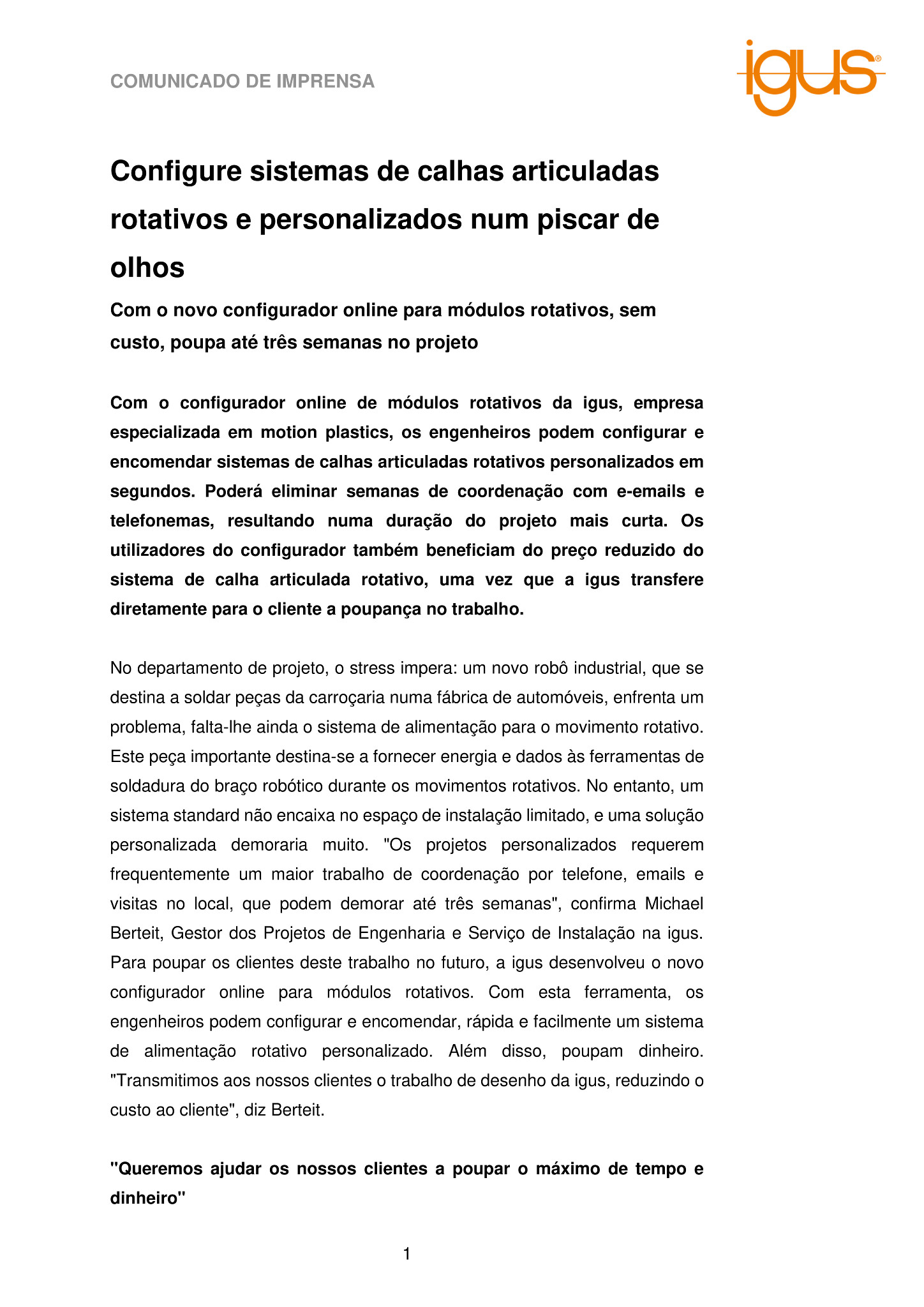 No departamento de projeto, o stress impera: um novo robô industrial, que se destina a soldar peças da carroçaria numa fábrica de automóveis, enfrenta um problema, falta-lhe ainda o sistema de alimentação para o movimento rotativo. Este peça importante destina-se a fornecer energia e dados às ferramentas de soldadura do braço robótico durante os movimentos rotativos. No entanto, um sistema standard não encaixa no espaço de instalação limitado, e uma solução personalizada demoraria muito. “Os projetos personalizados requerem frequentemente um maior trabalho de coordenação por telefone, emails e visitas no local, que podem demorar até três semanas”, confirma Michael Berteit, Gestor dos Projetos de Engenharia e Serviço de Instalação na igus. Para poupar os clientes deste trabalho no futuro, a igus desenvolveu o novo configurador online para módulos rotativos. Com esta ferramenta, os engenheiros podem configurar e encomendar, rápida e facilmente um sistema de alimentação rotativo personalizado. Além disso, poupam dinheiro. “Transmitimos aos nossos clientes o trabalho de desenho da igus, reduzindo o custo ao cliente”, diz Berteit.