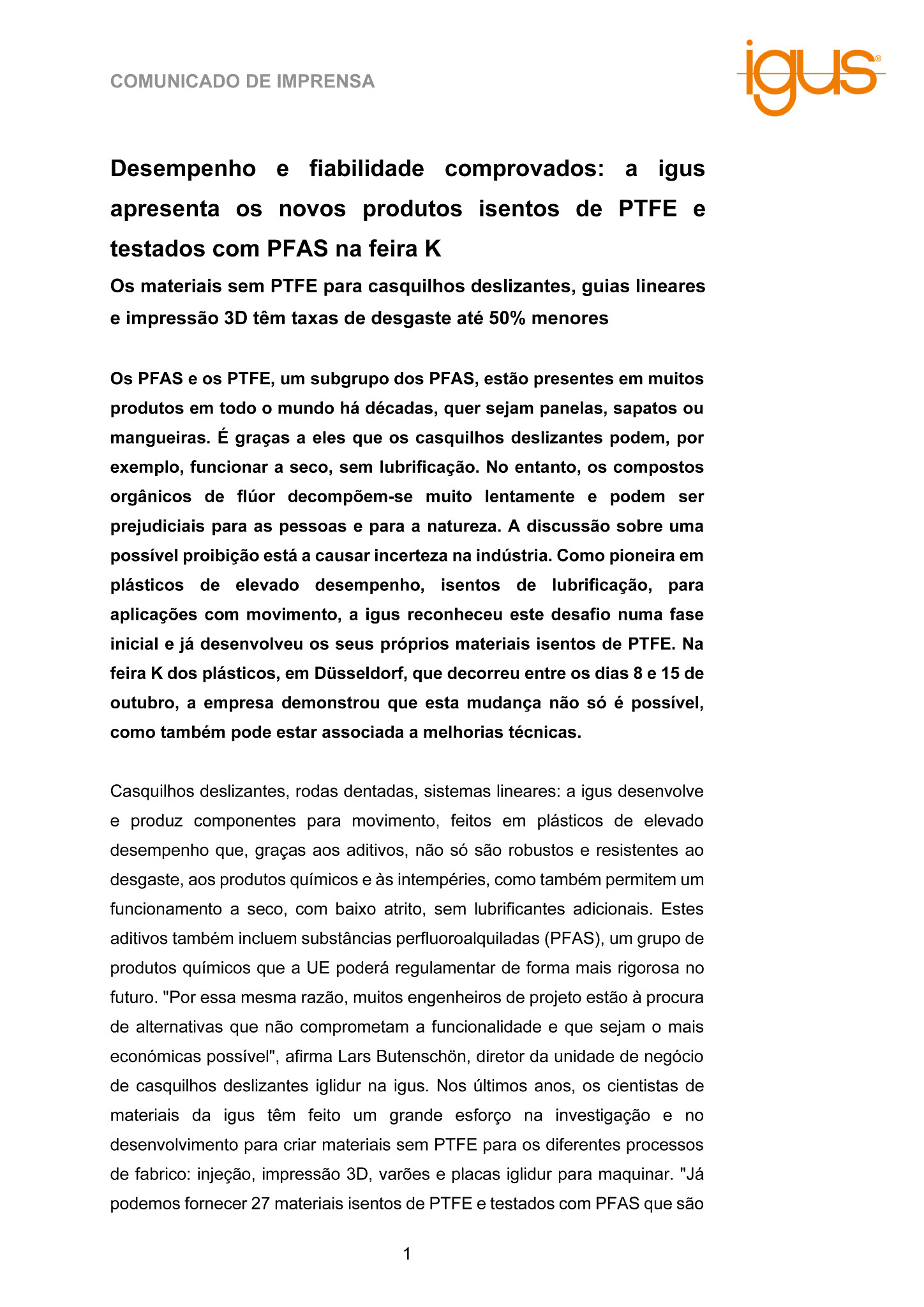 Os PFAS e os PTFE, um subgrupo dos PFAS, estão presentes em muitos produtos em todo o mundo há décadas, quer sejam panelas, sapatos ou mangueiras. É graças a eles que os casquilhos deslizantes podem, por exemplo, funcionar a seco, sem lubrificação. No entanto, os compostos orgânicos de flúor decompõem-se muito lentamente e podem ser prejudiciais para as pessoas e para a natureza. A discussão sobre uma possível proibição está a causar incerteza na indústria. Como pioneira em plásticos de elevado desempenho, isentos de lubrificação, para aplicações com movimento, a igus reconheceu este desafio numa fase inicial e já desenvolveu os seus próprios materiais isentos de PTFE. Na feira K dos plásticos, em Düsseldorf, que decorreu entre os dias 8 e 15 de outubro, a empresa demonstrou que esta mudança não só é possível, como também pode estar associada a melhorias técnicas.