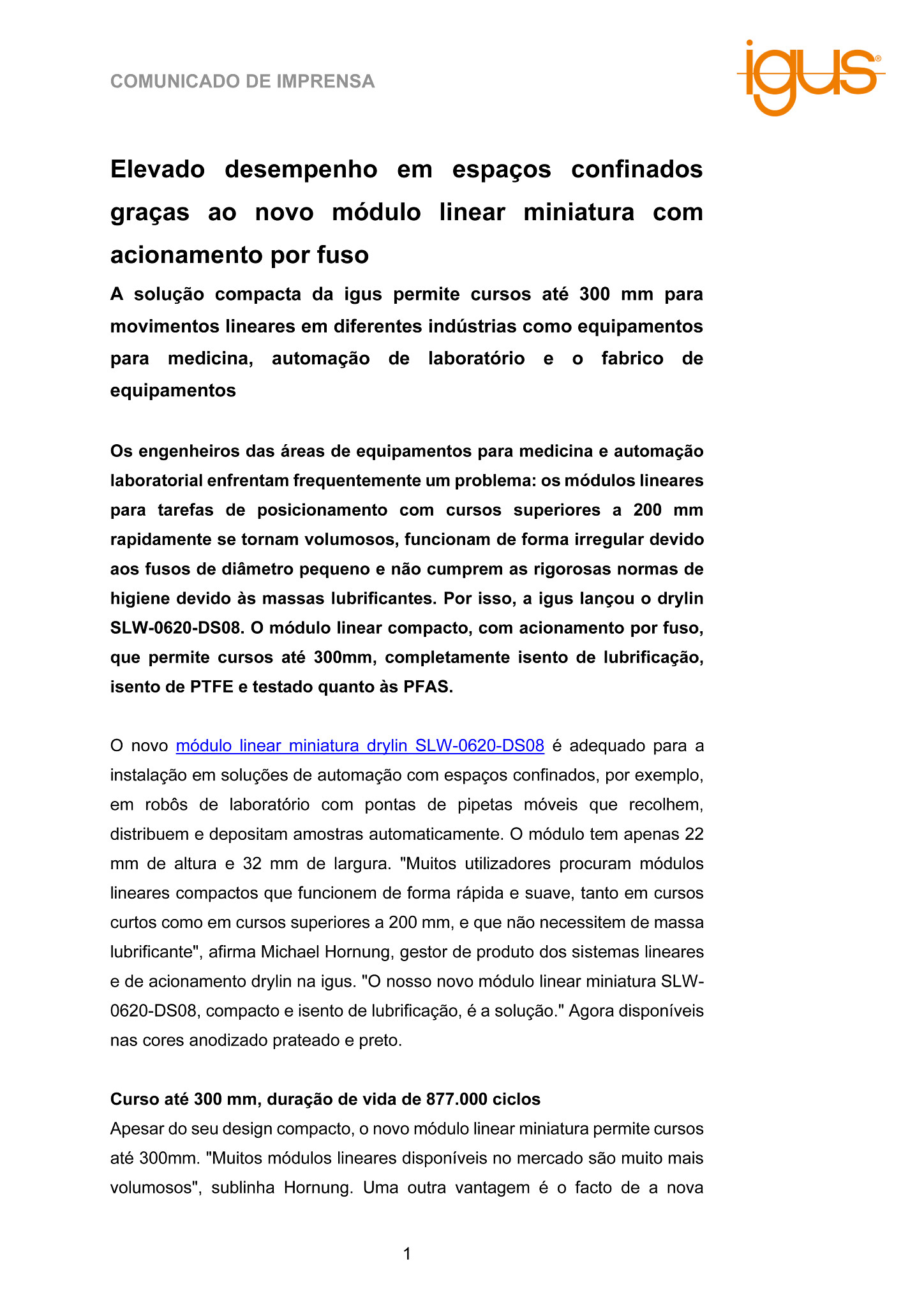 Os engenheiros das áreas de equipamentos para medicina e automação laboratorial enfrentam frequentemente um problema: os módulos lineares para tarefas de posicionamento com cursos superiores a 200 mm rapidamente se tornam volumosos, funcionam de forma irregular devido aos fusos de diâmetro pequeno e não cumprem as rigorosas normas de higiene devido às massas lubrificantes. Por isso, a igus lançou o drylin SLW-0620-DS08. O módulo linear compacto, com acionamento por fuso, que permite cursos até 300mm, completamente isento de lubrificação, isento de PTFE e testado quanto às PFAS.