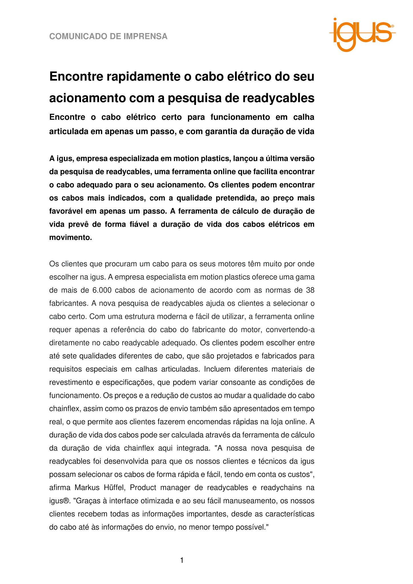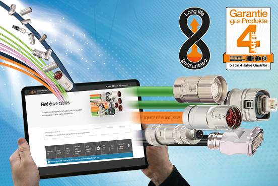 A igus, empresa especializada em motion plastics, lançou a última versão da pesquisa de readycables, uma ferramenta online que facilita encontrar o cabo adequado para o seu acionamento. Os clientes podem encontrar os cabos mais indicados, com a qualidade pretendida, ao preço mais favorável em apenas um passo. A ferramenta de cálculo de duração de vida prevê de forma fiável a duração de vida dos cabos elétricos em movimento.