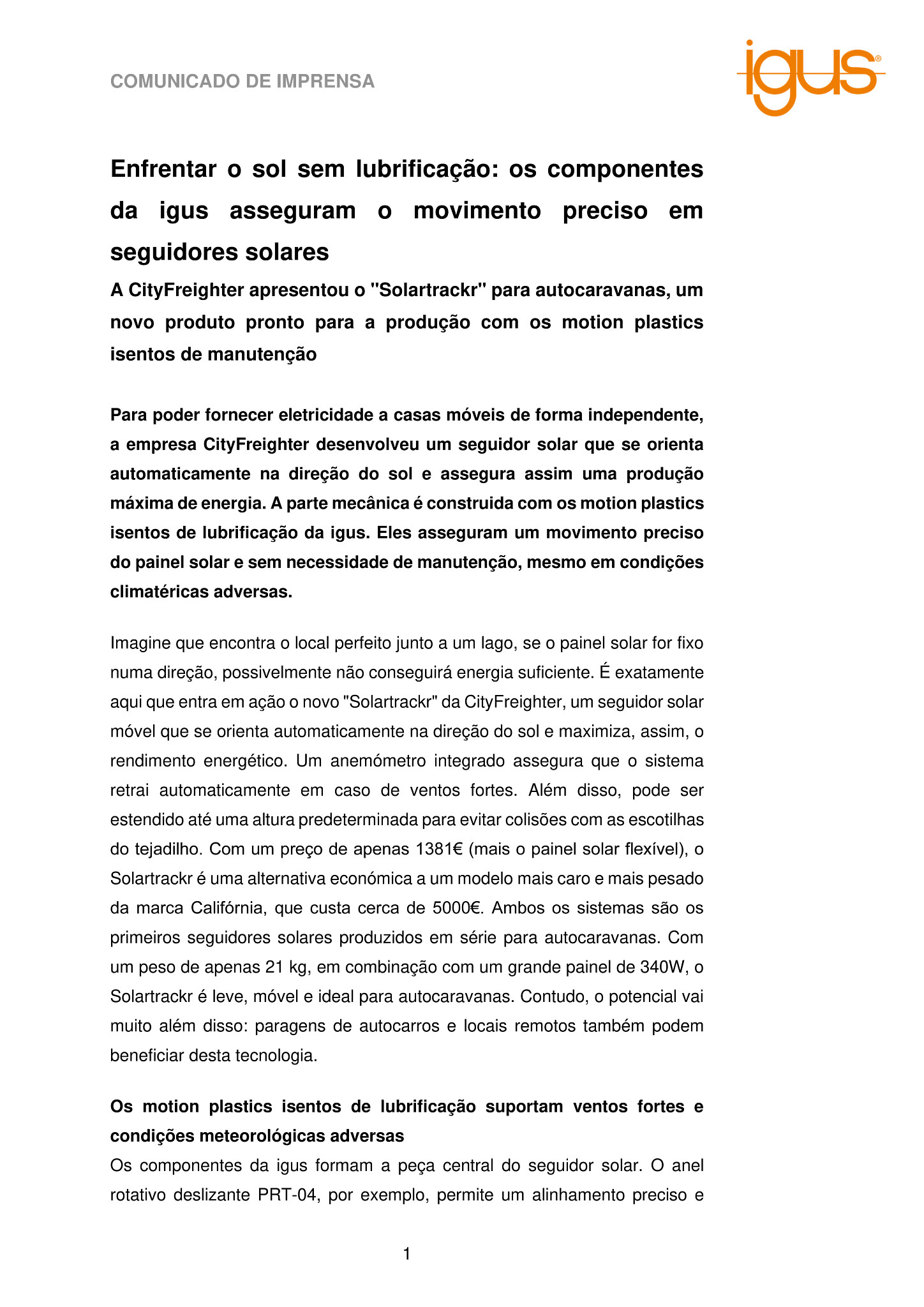 Os componentes da igus formam a peça central do seguidor solar. O anel rotativo deslizante PRT-04, por exemplo, permite um alinhamento preciso e isento de lubrificação dos painéis solares em qualquer direção. Além disso, as rodas dentadas impressas da igus garantem um ajuste angular preciso do anel rotativo deslizante. Desta forma, é possível encontrar sempre o melhor ângulo em relação ao sol, o que aumenta significativamente o rendimento energético. A altura do módulo é ajustada com a ajuda de um robusto fuso trapezoidal em aço inoxidável e a correspondente porca fabricada em plástico de elevada performance iglidur J, que funcionam com precisão mesmo sob condições climatéricas adversas. A CityFreighter também utiliza vários casquilhos deslizantes e anilhas planas da igus feitas nos materiais maratonistas iglidur J, iglidur G e iglidur W300. Estes componentes caracterizam-se pela sua durabilidade, isenção de manutenção e resistência ao desgaste, o que os torna ideais para utilização em ambientes agressivos. “Os componentes da igus têm um papel decisivo no nosso Solartrackr. A isenção de lubrificação, precisão e durabilidade permitem-nos oferecer uma solução fiável e isenta de manutenção que, não só é eficiente, mas também económica”, explica Michael Schoering, Diretor Geral da CityFreighter Europe GmbH. O Solartrackr está atualmente em transição de protótipo para a produção em série, com a empresa a preparar-se para grandes volumes. Para impulsionar este processo, Michael Schoering lançou uma campanha de pré-venda numa plataforma de crédito colaborativo. Os primeiros patrocinadores e investidores têm a oportunidade de ser os primeiros a comprar o Solartrackr e de beneficiar diretamente da tecnologia pioneira.