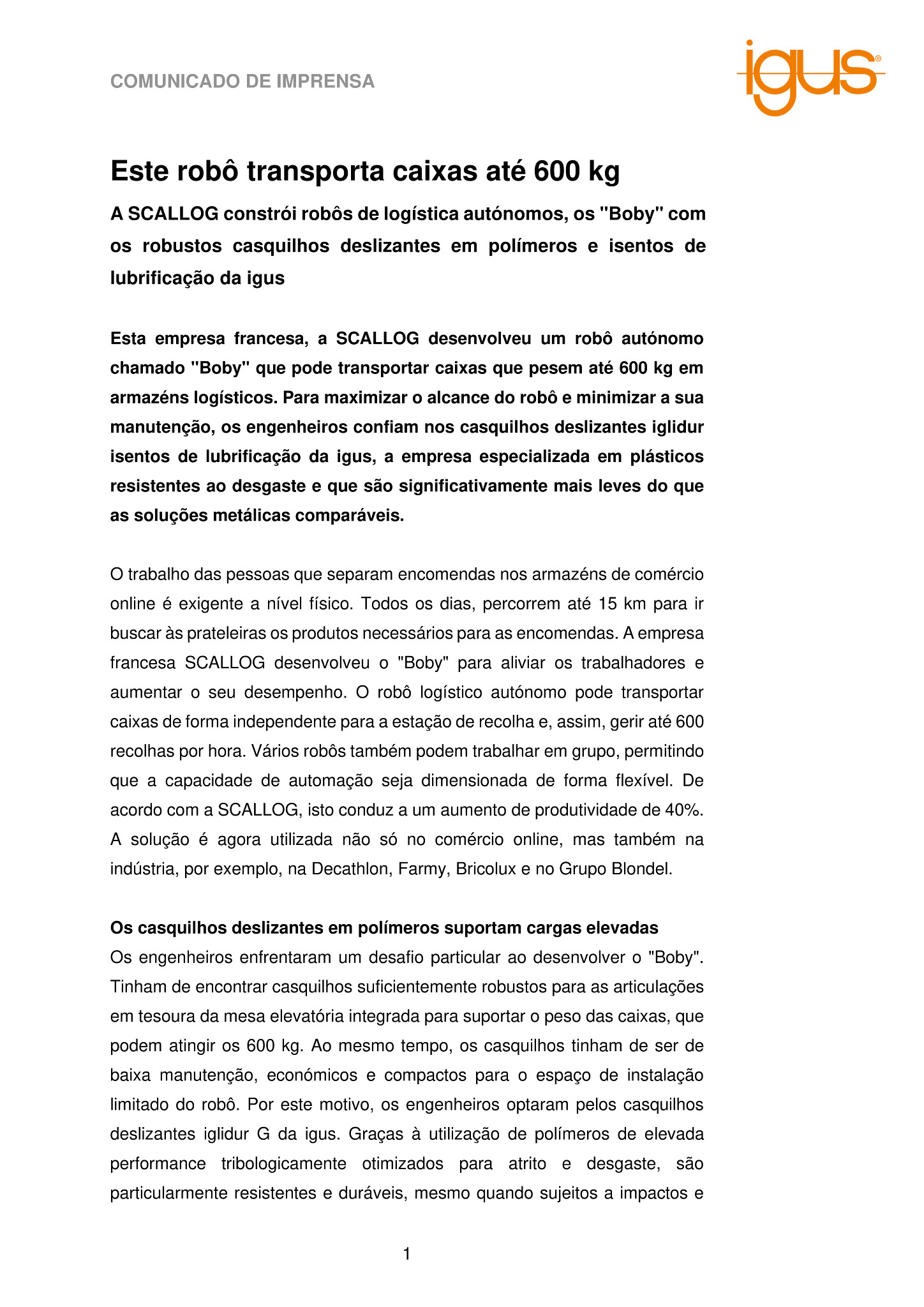 Esta empresa francesa, a SCALLOG desenvolveu um robô autónomo chamado “Boby” que pode transportar caixas que pesem até 600 kg em armazéns logísticos. Para maximizar o alcance do robô e minimizar a sua manutenção, os engenheiros confiam nos casquilhos deslizantes iglidur isentos de lubrificação da igus, a empresa especializada em plásticos resistentes ao desgaste e que são significativamente mais leves do que as soluções metálicas comparáveis.