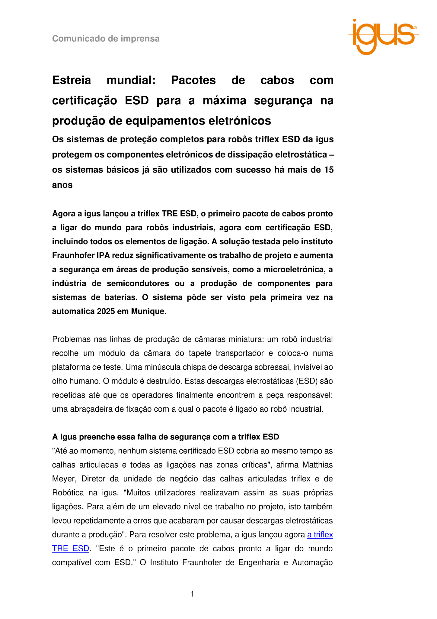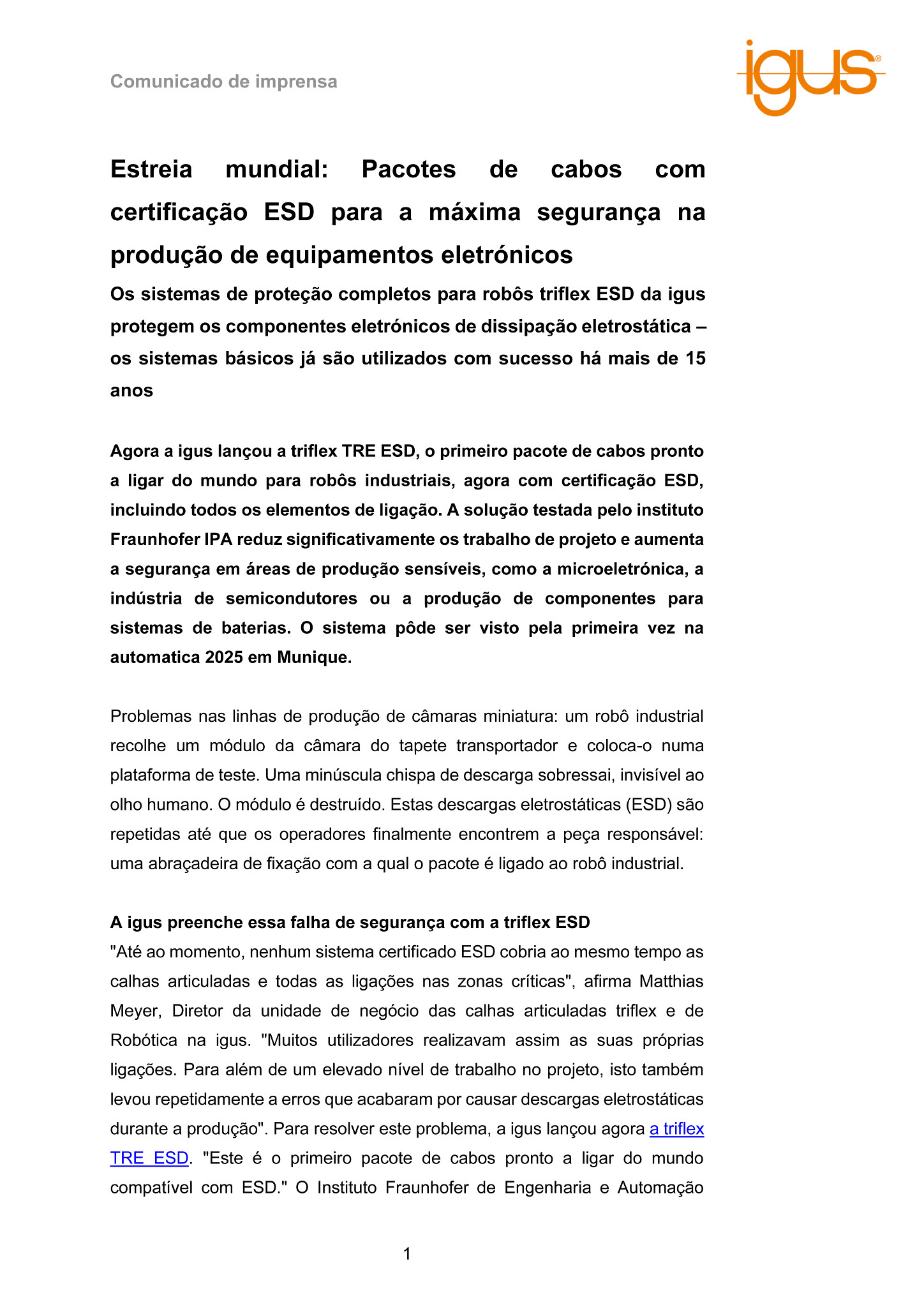 Agora a igus lançou a triflex TRE ESD, o primeiro pacote de cabos pronto a ligar do mundo para robôs industriais, agora com certificação ESD, incluindo todos os elementos de ligação. A solução testada pelo instituto Fraunhofer IPA reduz significativamente os trabalho de projeto e aumenta a segurança em áreas de produção sensíveis, como a microeletrónica, a indústria de semicondutores ou a produção de componentes para sistemas de baterias. O sistema pôde ser visto pela primeira vez na automatica 2025 em Munique.
