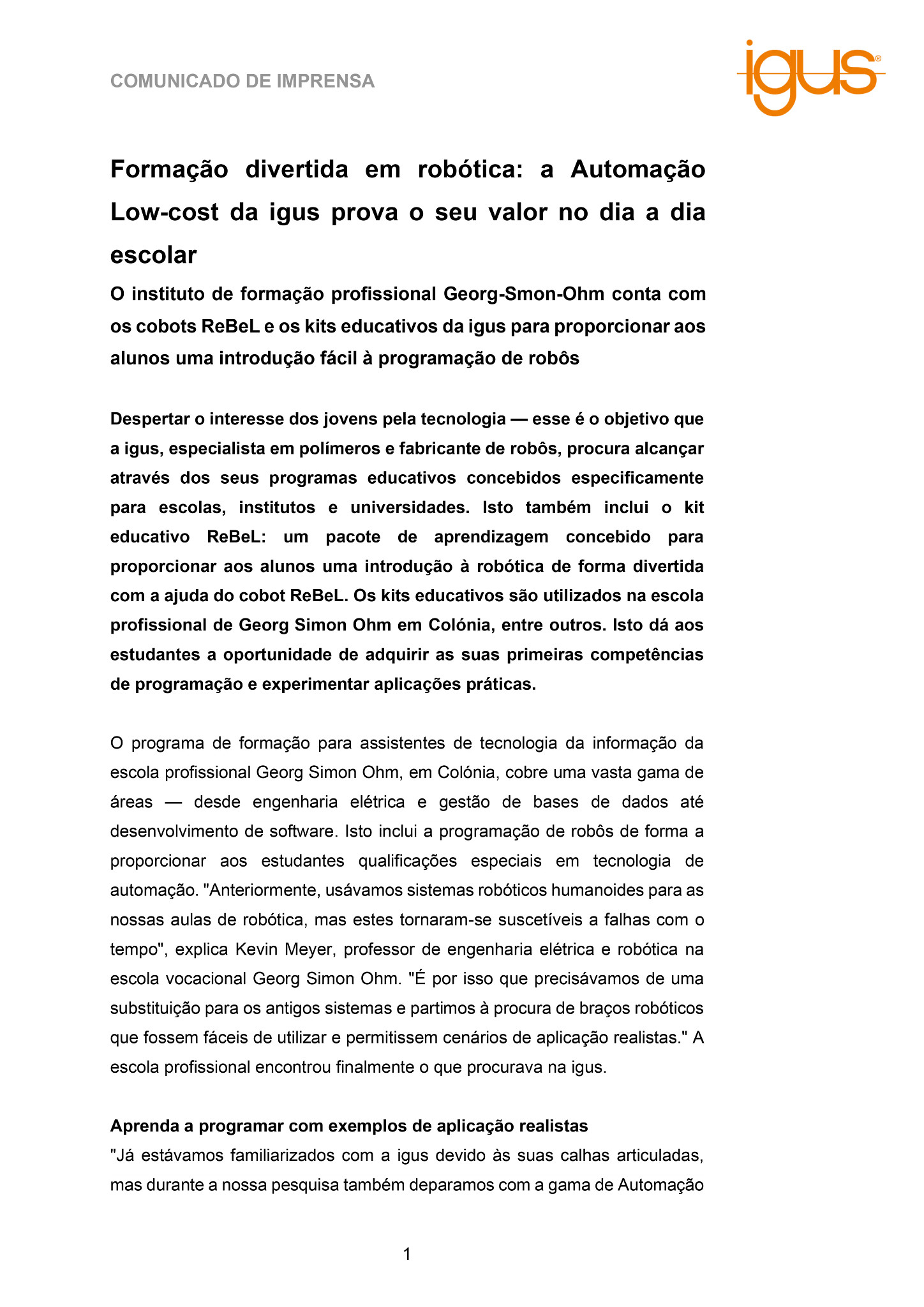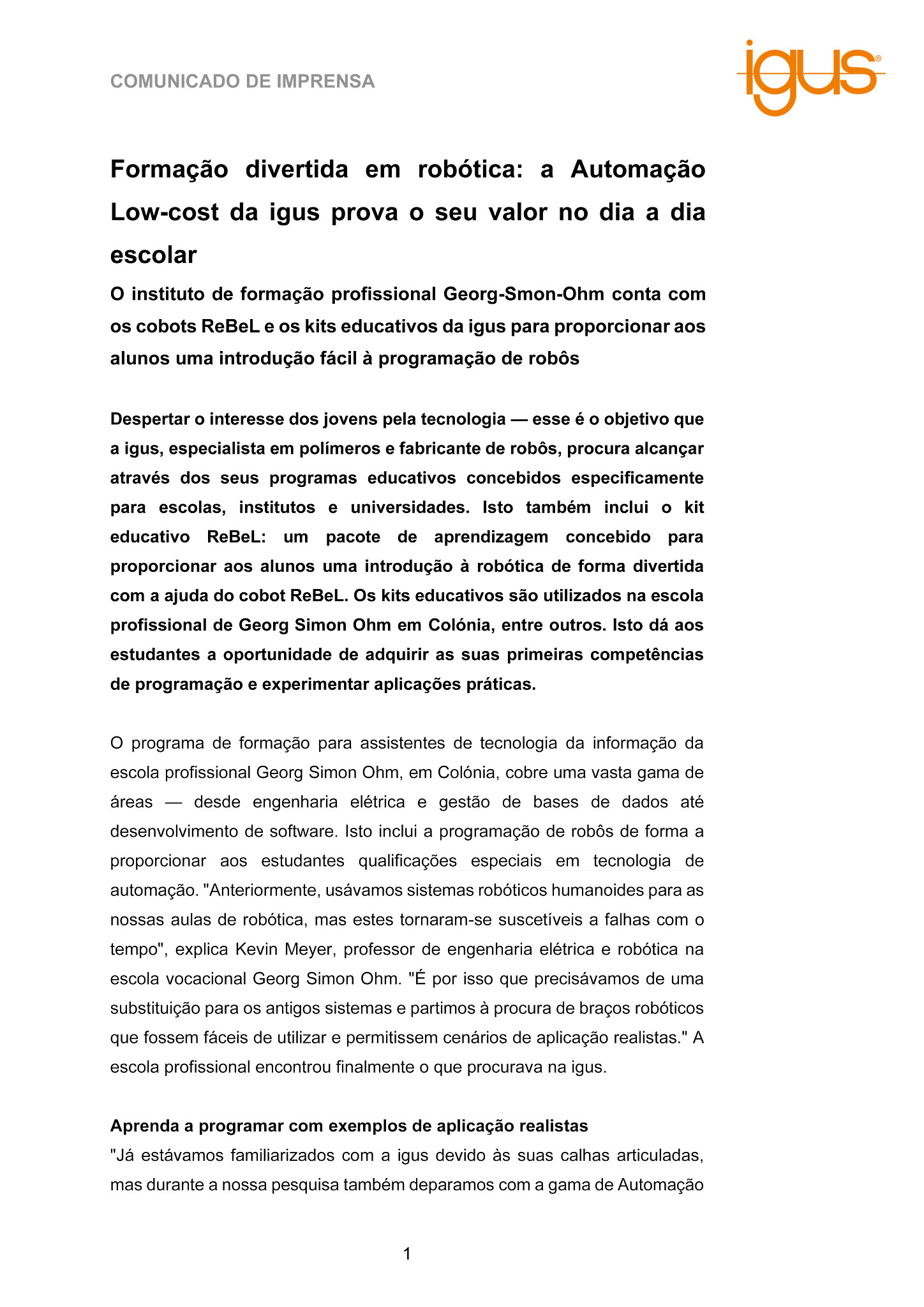 Os cobots e kits educativos ReBeL estão em utilização há um ano em quatro salas de robótica de uma escola profissional. “A maioria dos alunos gosta mesmo de trabalhar com os robôs. Alguns acharam difícil no início, mas no final todos conseguiram,” afirma Kevin Meyer. O software é visualmente muito claro e permite aos alunos fazerem progressos rápidos. Alexander Mühlens, Diretor da Unidade de Negócios de Automação Low-cost da igus, sublinha: “É muito importante para nós promover a próxima geração de robôs, e é por isso que estamos sempre particularmente satisfeitos com projetos como este. Com a nossa vasta gama de programas educativos, queremos apoiar escolas, institutos e universidades na transmissão de conhecimentos teóricos de uma forma prática, preparando os alunos especificamente para o mundo profissional moderno”.