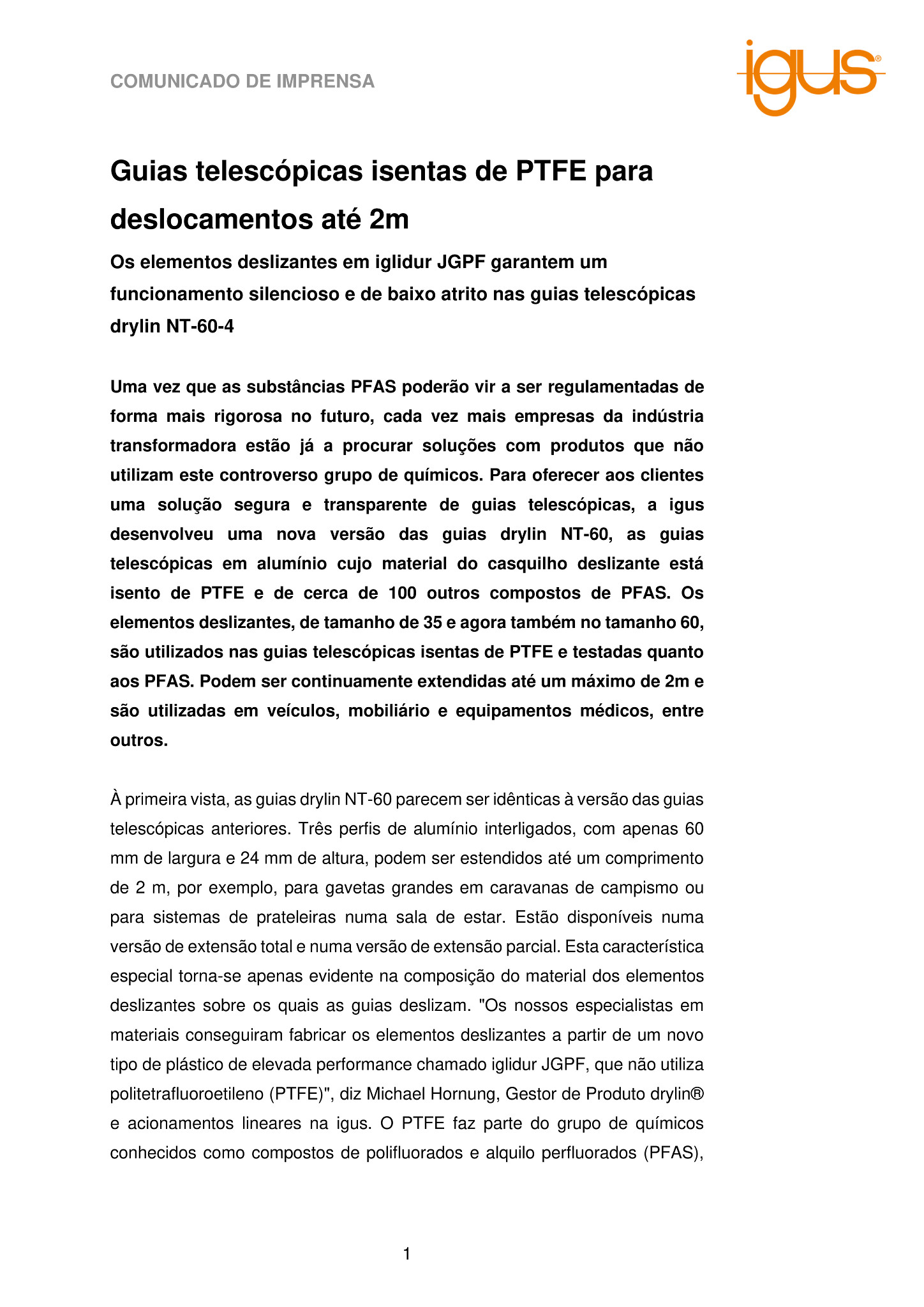 Com o material dos casquilhos deslizantes isento de PTFE da guia telescópica drylin NT-60-4, o desenvolvimento de materiais na igus demonstra mais uma vez que é possível dispensar os PFAS sem sacrificar as características técnicas. Os especialistas conseguiram provar a robustez do material no laboratório interno de testes. Duas guias telescópicas da série drylin NT-60 suportaram uma carga centrada de 200N numa posição vertical. O sistema continuava a funcionar mesmo após 25.000 ciclos de abertura e fecho. “Atribuímos uma grande importância à sucessiva expansão da gama de sistemas lineares drylin para incluir estas variantes robustas e isentas de PTFE”, afirma Hornung. ” Para além da série de guias telescópicas, a gama de produtos sem PTFE também inclui carruagens em plástico maciço drylin W, carruagens prismáticas planas com pré-carga da família drylin N e patins da série drylin T, que também podem ser substituídos nos sistemas existentes pela versão isenta de PTFE”