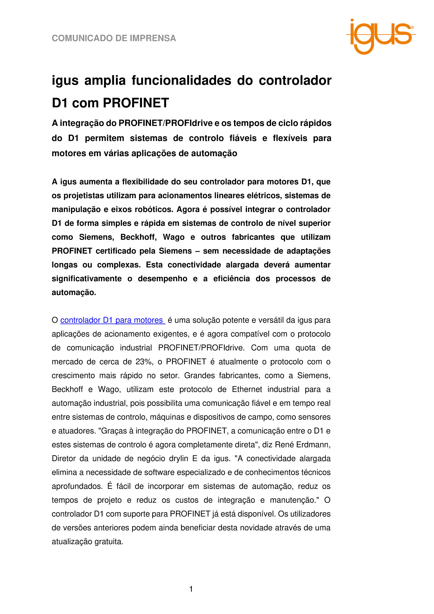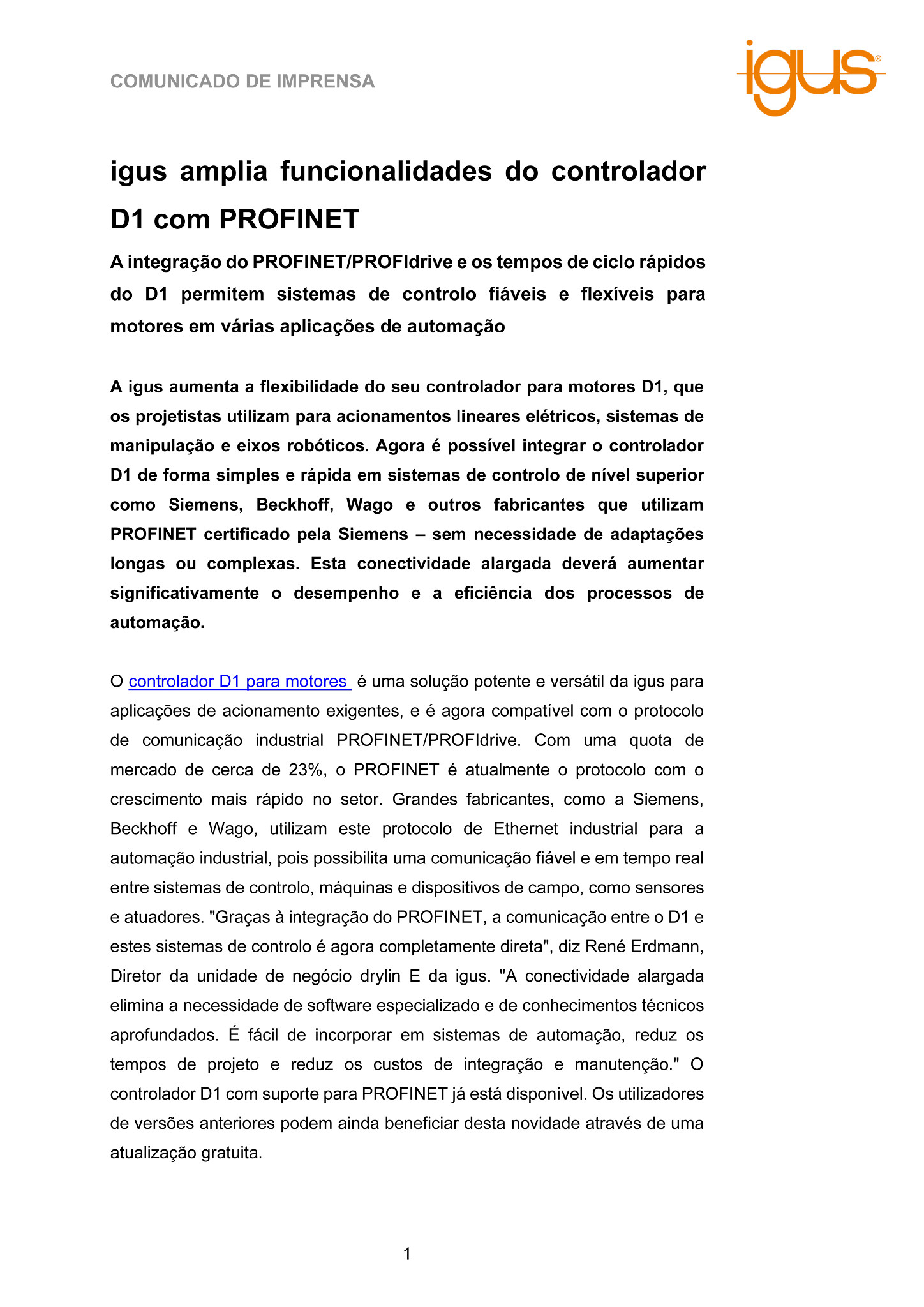 O controlador D1 para motores é uma solução potente e versátil da igus para aplicações de acionamento exigentes, e é agora compatível com o protocolo de comunicação industrial PROFINET/PROFIdrive. Com uma quota de mercado de cerca de 23%, o PROFINET é atualmente o protocolo com o crescimento mais rápido no setor. Grandes fabricantes, como a Siemens, Beckhoff e Wago, utilizam este protocolo de Ethernet industrial para a automação industrial, pois possibilita uma comunicação fiável e em tempo real entre sistemas de controlo, máquinas e dispositivos de campo, como sensores e atuadores. “Graças à integração do PROFINET, a comunicação entre o D1 e estes sistemas de controlo é agora completamente direta”, diz René Erdmann, Diretor da unidade de negócio drylin E da igus. “A conectividade alargada elimina a necessidade de software especializado e de conhecimentos técnicos aprofundados. É fácil de incorporar em sistemas de automação, reduz os tempos de projeto e reduz os custos de integração e manutenção.” O controlador D1 com suporte para PROFINET já está disponível. Os utilizadores de versões anteriores podem ainda beneficiar desta novidade através de uma atualização gratuita.