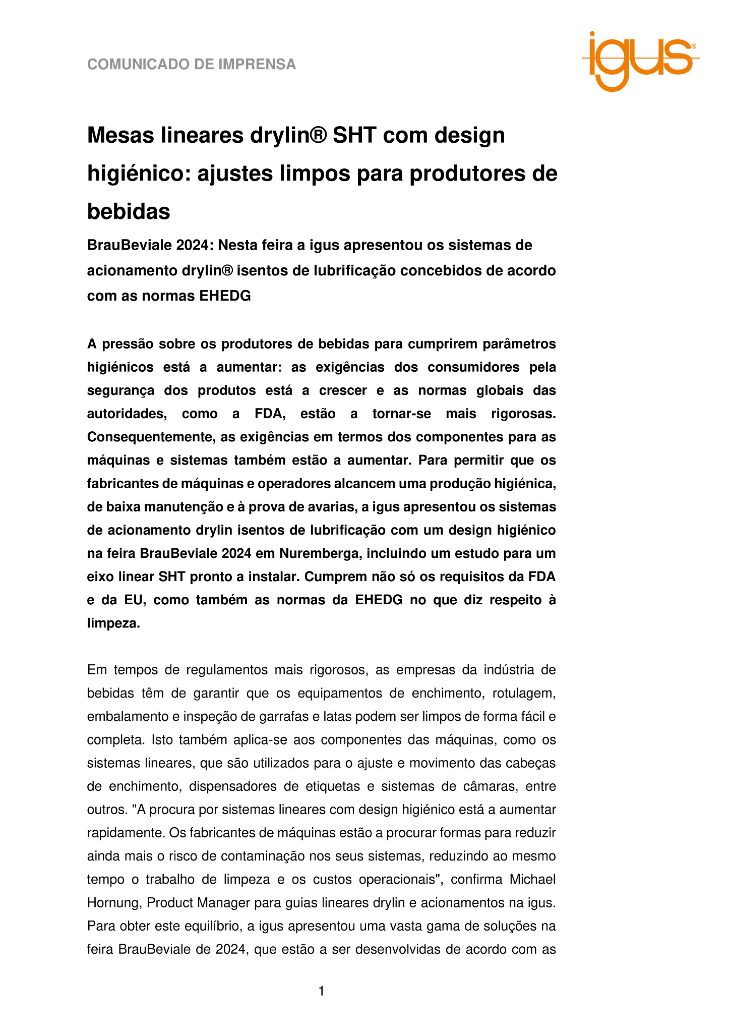 BrauBeviale 2024: Nesta feira a igus apresentou os sistemas de acionamento drylin® isentos de lubrificação concebidos de acordo com as normas EHEDG