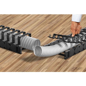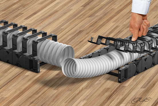 Para poder guiar com segurança grandes mangueiras, a igus desenvolveu agora uma nova travessa extensível para a sua série de calhas articuladas modulares E4Q. Com a ajuda de um sistema adaptado, a calha articulada pode ser alterada individualmente ao diâmetro da mangueira. O mecanismo de abertura sem ferramentas da E4Q garante a fácil instalação e preenchimento da calha articulada.