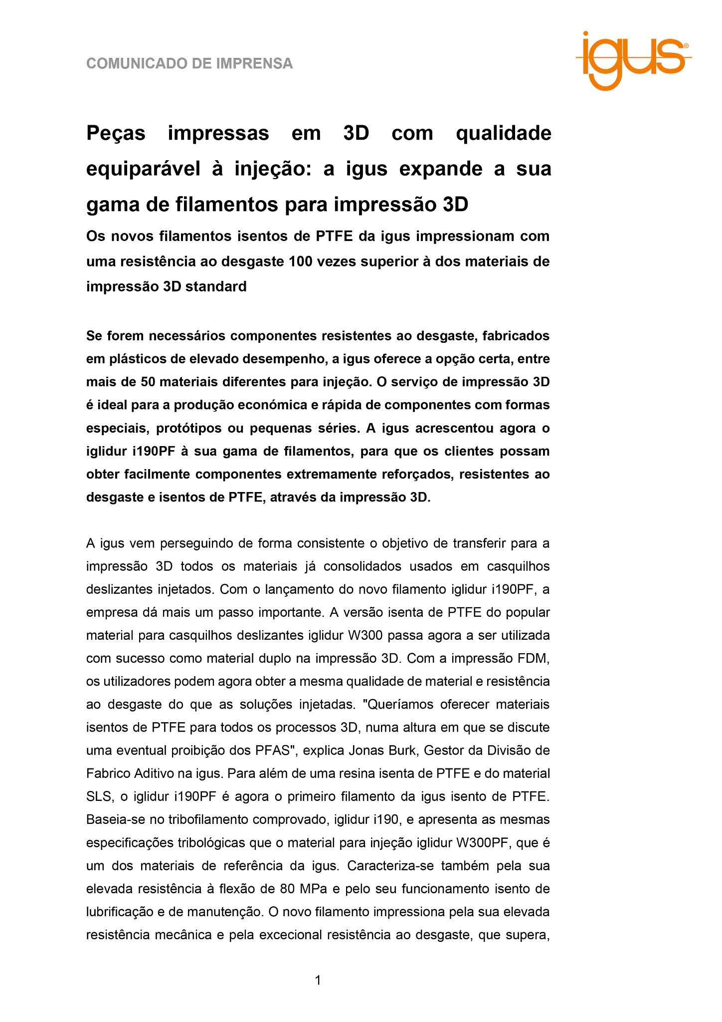 A igus vem perseguindo de forma consistente o objetivo de transferir para a impressão 3D todos os materiais já consolidados usados em casquilhos deslizantes injetados. Com o lançamento do novo filamento iglidur i190PF, a empresa dá mais um passo importante. A versão isenta de PTFE do popular material para casquilhos deslizantes iglidur W300 passa agora a ser utilizada com sucesso como material duplo na impressão 3D. Com a impressão FDM, os utilizadores podem agora obter a mesma qualidade de material e resistência ao desgaste do que as soluções injetadas. “Queríamos oferecer materiais isentos de PTFE para todos os processos 3D, numa altura em que se discute uma eventual proibição dos PFAS”, explica Jonas Burk, Gestor da Divisão de Fabrico Aditivo na igus. Para além de uma resina isenta de PTFE e do material SLS, o iglidur i190PF é agora o primeiro filamento da igus isento de PTFE. Baseia-se no tribofilamento comprovado, iglidur i190, e apresenta as mesmas especificações tribológicas que o material para injeção iglidur W300PF, que é um dos materiais de referência da igus. Caracteriza-se também pela sua elevada resistência à flexão de 80 MPa e pelo seu funcionamento isento de lubrificação e de manutenção. O novo filamento impressiona pela sua elevada resistência mecânica e pela excecional resistência ao desgaste, que supera, significativamente, os plásticos comuns, como o ABS ou o nylon. Os componentes impressos podem ser utilizados a temperaturas até 90°C e apresentam uma elevada duração de vida sem necessidade de lubrificação. O iglidur i190PF também é adequado para o desenho de peças deslizantes para componentes com vários materiais, uma vez que apresenta uma excelente aderência a materiais altamente rígidos. O filamento pode ser facilmente processado em todas as impressoras 3D disponíveis no mercado que possuam placas de impressão aquecidas.