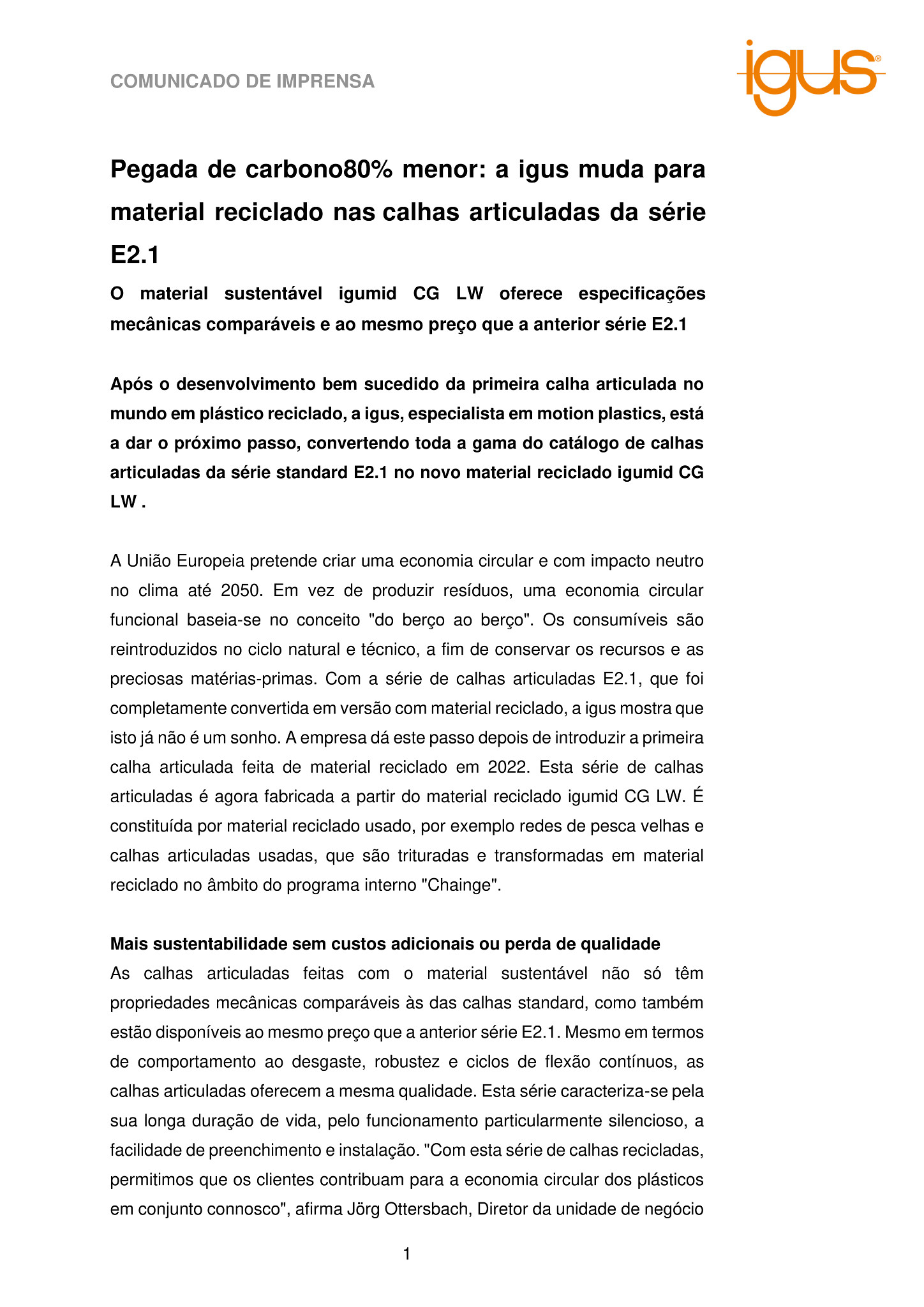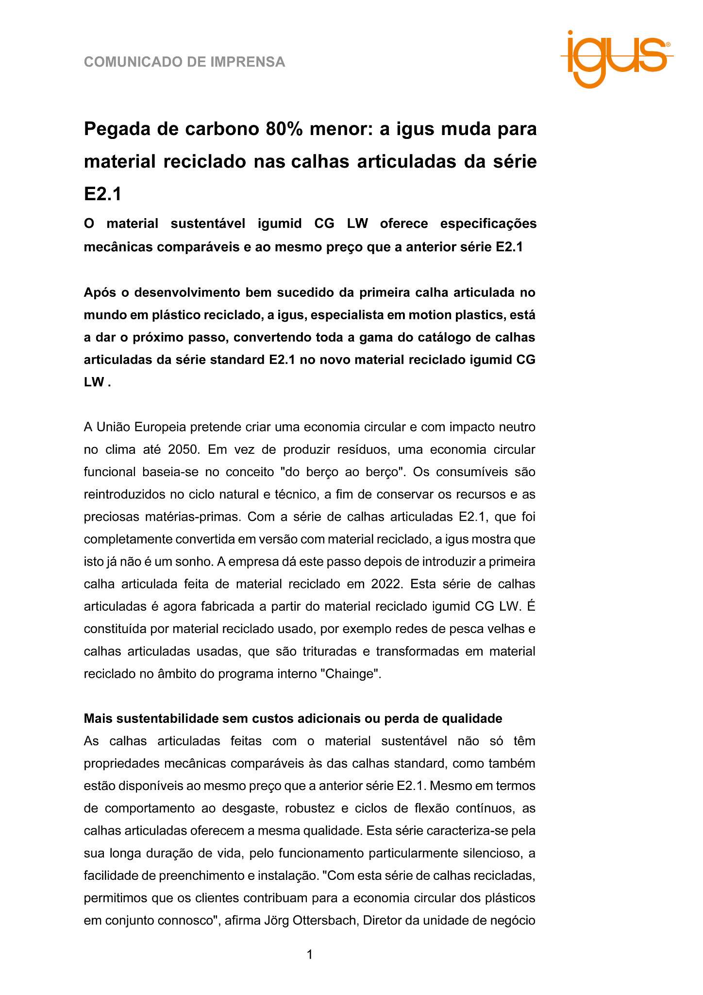 As calhas articuladas feitas com o material sustentável não só têm propriedades mecânicas comparáveis às das calhas standard, como também estão disponíveis ao mesmo preço que a anterior série E2.1. Mesmo em termos de comportamento ao desgaste, robustez e ciclos de flexão contínuos, as calhas articuladas oferecem a mesma qualidade. Esta série caracteriza-se pela sua longa duração de vida, pelo funcionamento particularmente silencioso, a facilidade de preenchimento e instalação. “Com esta série de calhas recicladas, permitimos que os clientes contribuam para a economia circular dos plásticos em conjunto connosco”, afirma Jörg Ottersbach, Diretor da unidade de negócio de calhas articuladas na igus. “Ao mudar para o igumid CG LW, estamos a demonstrar que a economia circular e a relação custo-eficiência não se excluem mutuamente.”