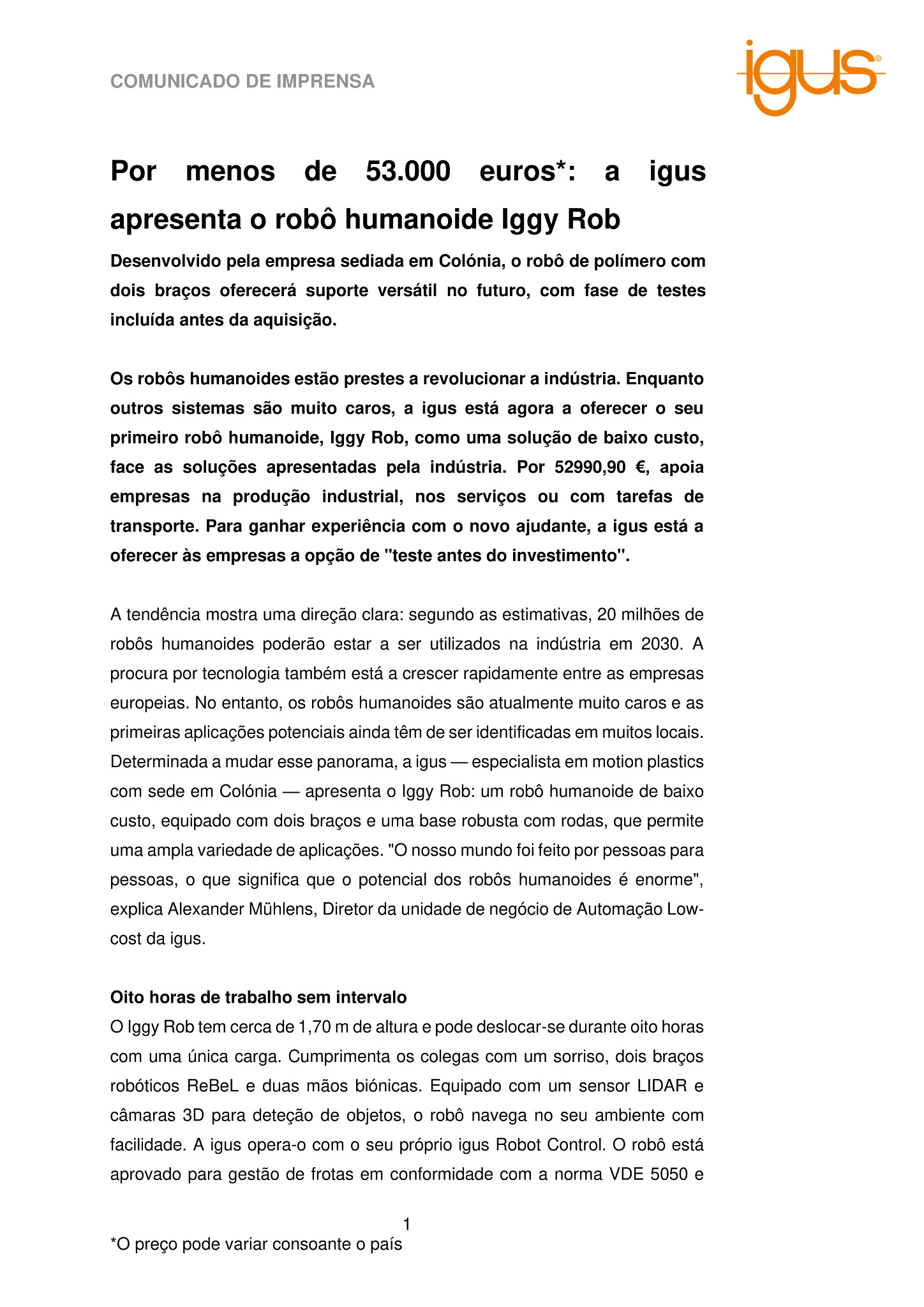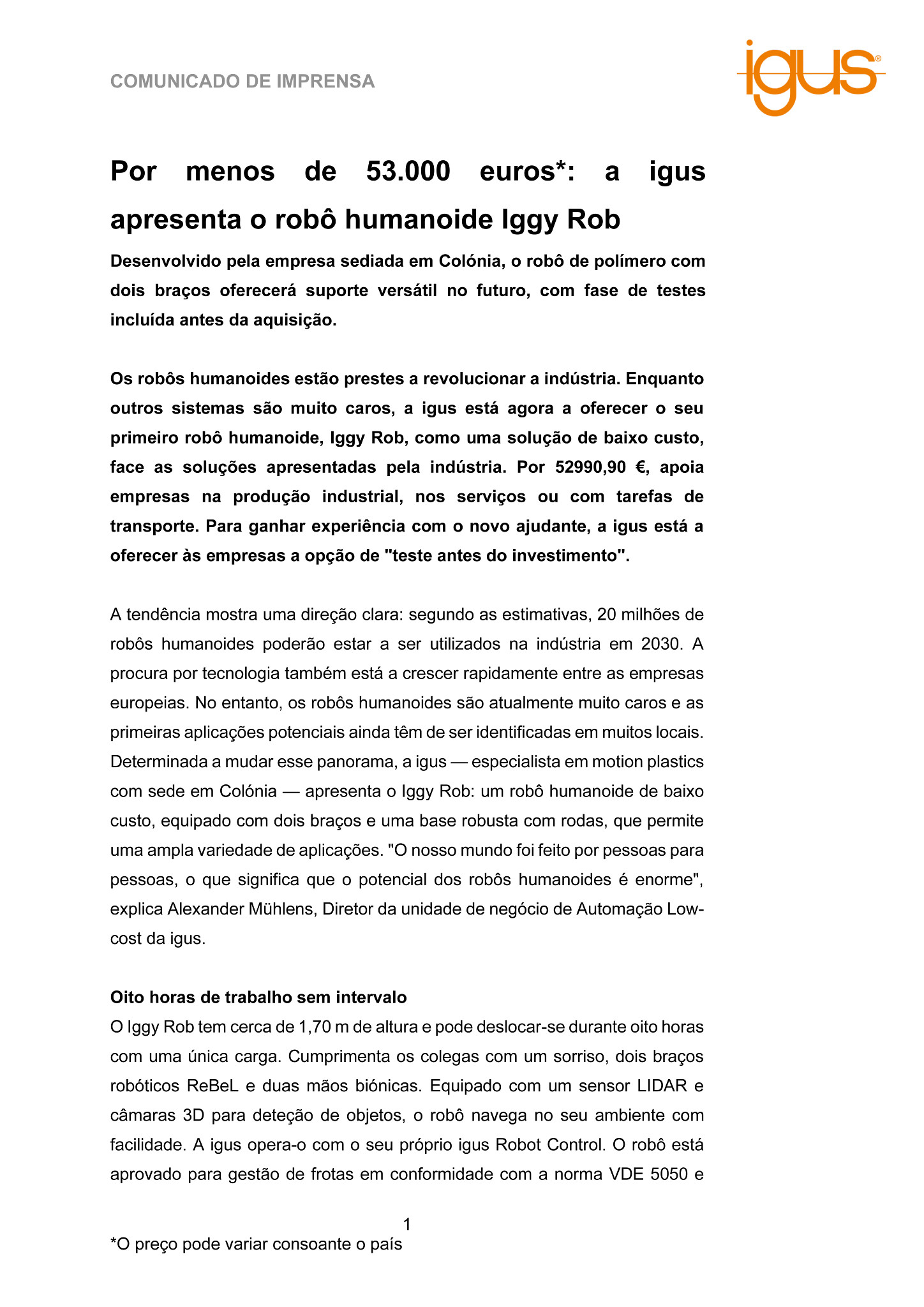 Os robôs humanoides estão prestes a revolucionar a indústria. Enquanto outros sistemas são muito caros, a igus está agora a oferecer o seu primeiro robô humanoide, Iggy Rob, como uma solução de baixo custo, face as soluções apresentadas pela indústria. Por 52990,90 €, apoia empresas na produção industrial, nos serviços ou com tarefas de transporte. Para ganhar experiência com o novo ajudante, a igus está a oferecer às empresas a opção de “teste antes do investimento”.