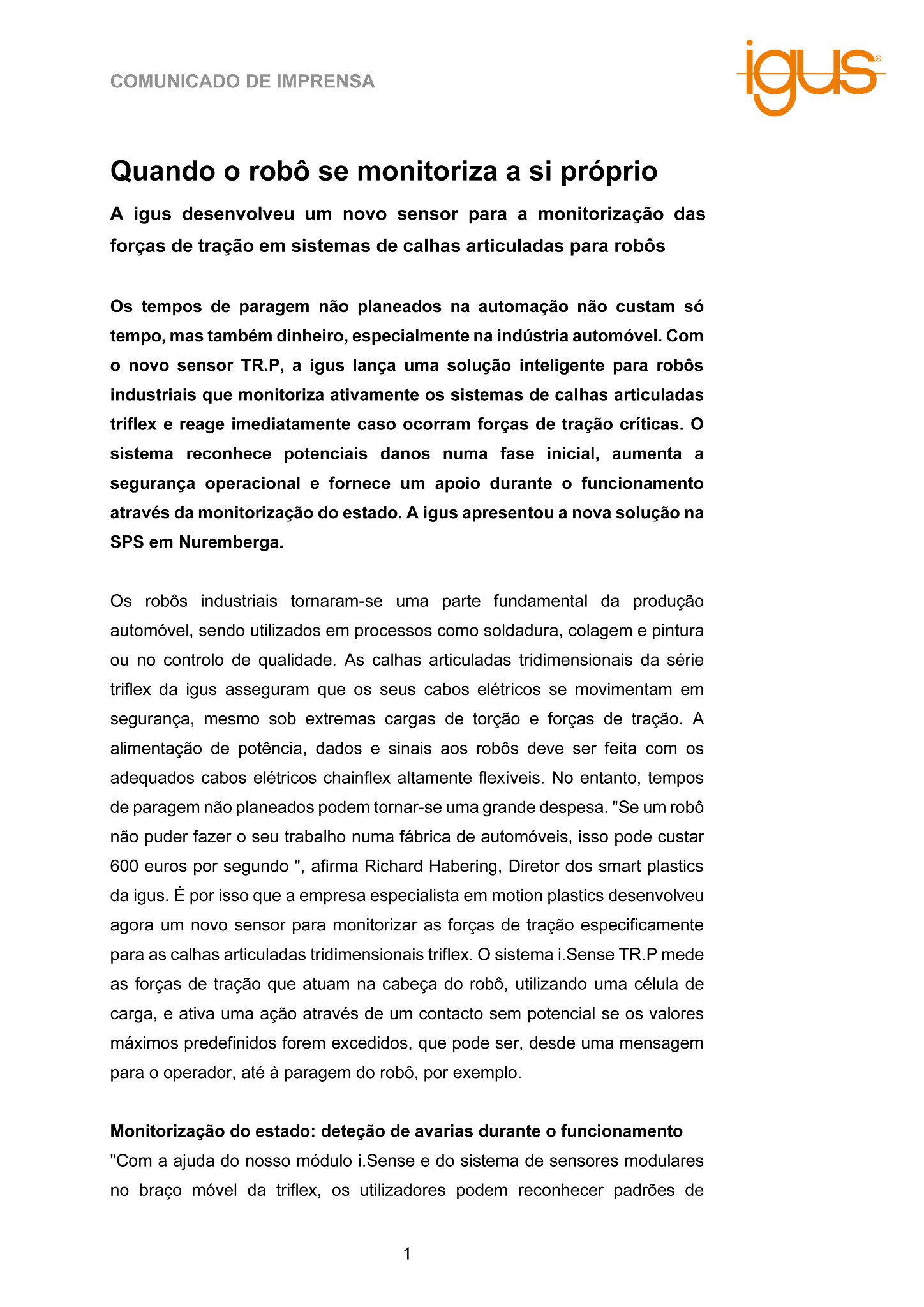 Os tempos de paragem não planeados na automação não custam só tempo, mas também dinheiro, especialmente na indústria automóvel. Com o novo sensor TR.P, a igus lança uma solução inteligente para robôs industriais que monitoriza ativamente os sistemas de calhas articuladas triflex e reage imediatamente caso ocorram forças de tração críticas. O sistema reconhece potenciais danos numa fase inicial, aumenta a segurança operacional e fornece um apoio durante o funcionamento através da monitorização do estado. A igus apresentou a nova solução na SPS em Nuremberga.