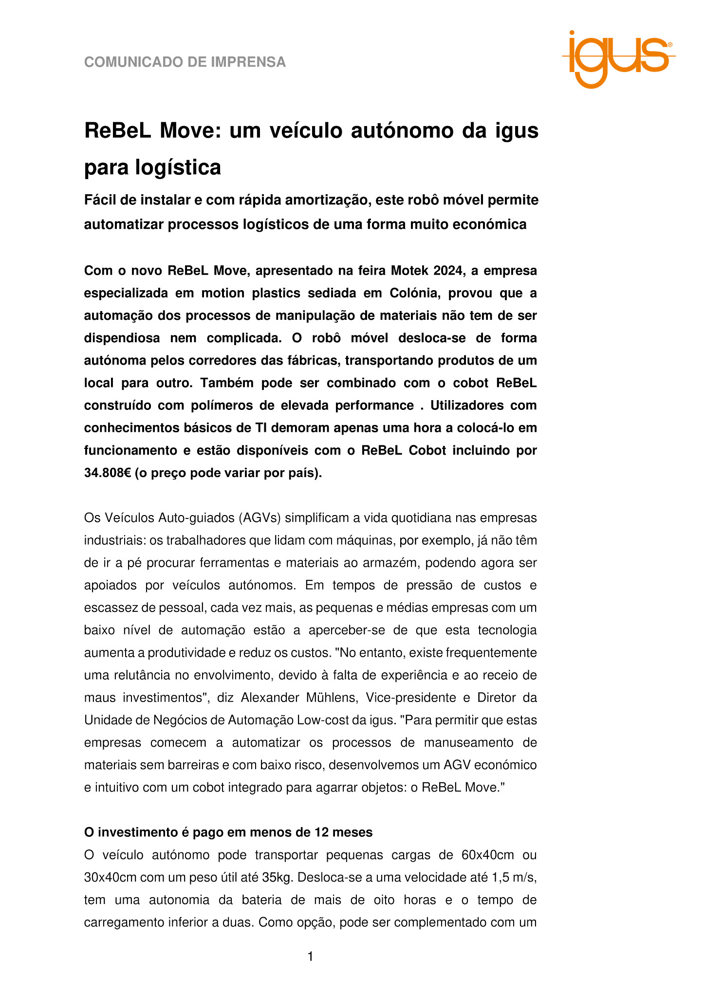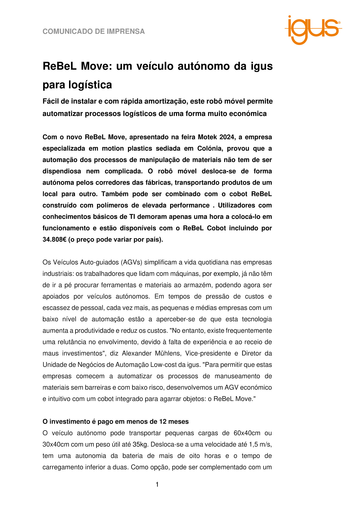 O veículo autónomo pode transportar pequenas cargas de 60x40cm ou 30x40cm com um peso útil até 35kg. Desloca-se a uma velocidade até 1,5 m/s, tem uma autonomia da bateria de mais de oito horas e o tempo de carregamento inferior a duas. Como opção, pode ser complementado com um cobot ReBeL, que a igus fabrica quase inteiramente em polímeros de elevada performance, robusto e económico. Com um preço unitário de apenas 4.970€ para a versão totalmente equipada, é cinco vezes mais barato do que os modelos comparáveis em metal. Tem um peso de 8,2 kg, uma carga útil de 2 kg e um alcance de 664 mm. “Com apenas 34.808€, o ReBeL Move custa apenas uma fração de um AGV convencional, o que significa que o investimento fica pago em 12 meses,” diz Mühlens.