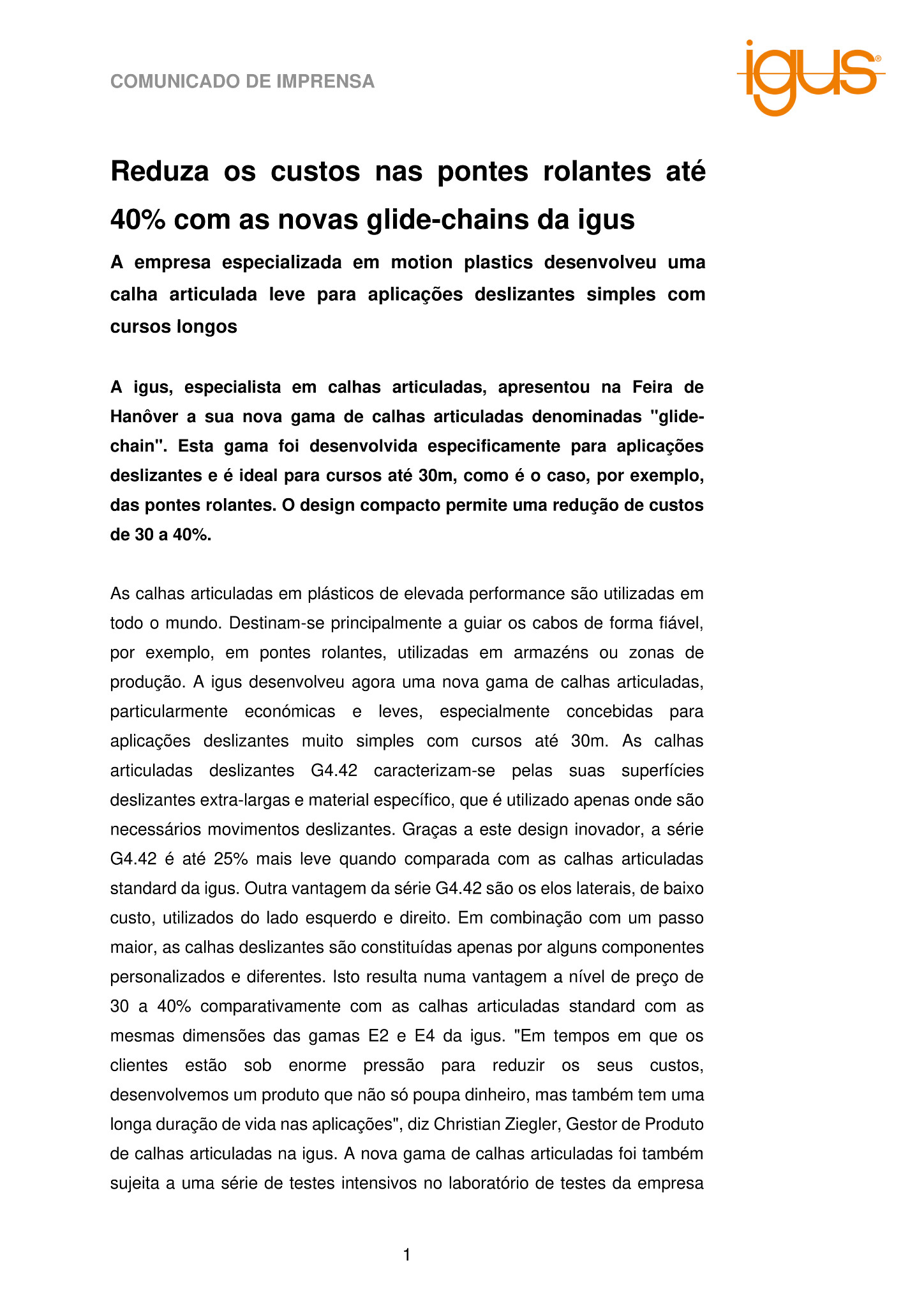 A igus, especialista em calhas articuladas, apresentou na Feira de Hanôver a sua nova gama de calhas articuladas denominadas “glide-chain”. Esta gama foi desenvolvida especificamente para aplicações deslizantes e é ideal para cursos até 30m, como é o caso, por exemplo, das pontes rolantes. O design compacto permite uma redução de custos de 30 a 40%.