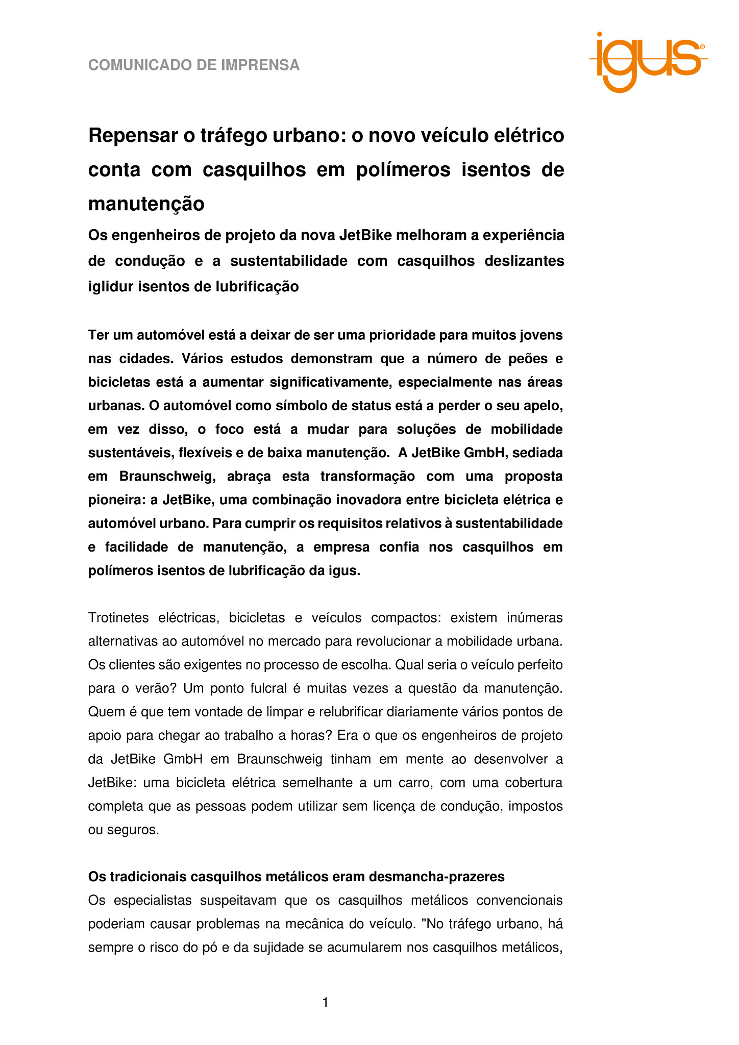Os especialistas suspeitavam que os casquilhos metálicos convencionais poderiam causar problemas na mecânica do veículo. “No tráfego urbano, há sempre o risco do pó e da sujidade se acumularem nos casquilhos metálicos, comprometendo um funcionamento suave e silencioso,” diz Enno Hecker, CEO da JetBike GmbH. Além disso, o risco constante de corrosão e a necessidade de relubrificação tornam estas soluções pouco práticas para veículos do dia a dia. “Por isso, decidimos substituir os casquilhos metálicos por alternativas em polímeros isentos de lubrificação da igus, uma decisão que valeu a pena.”