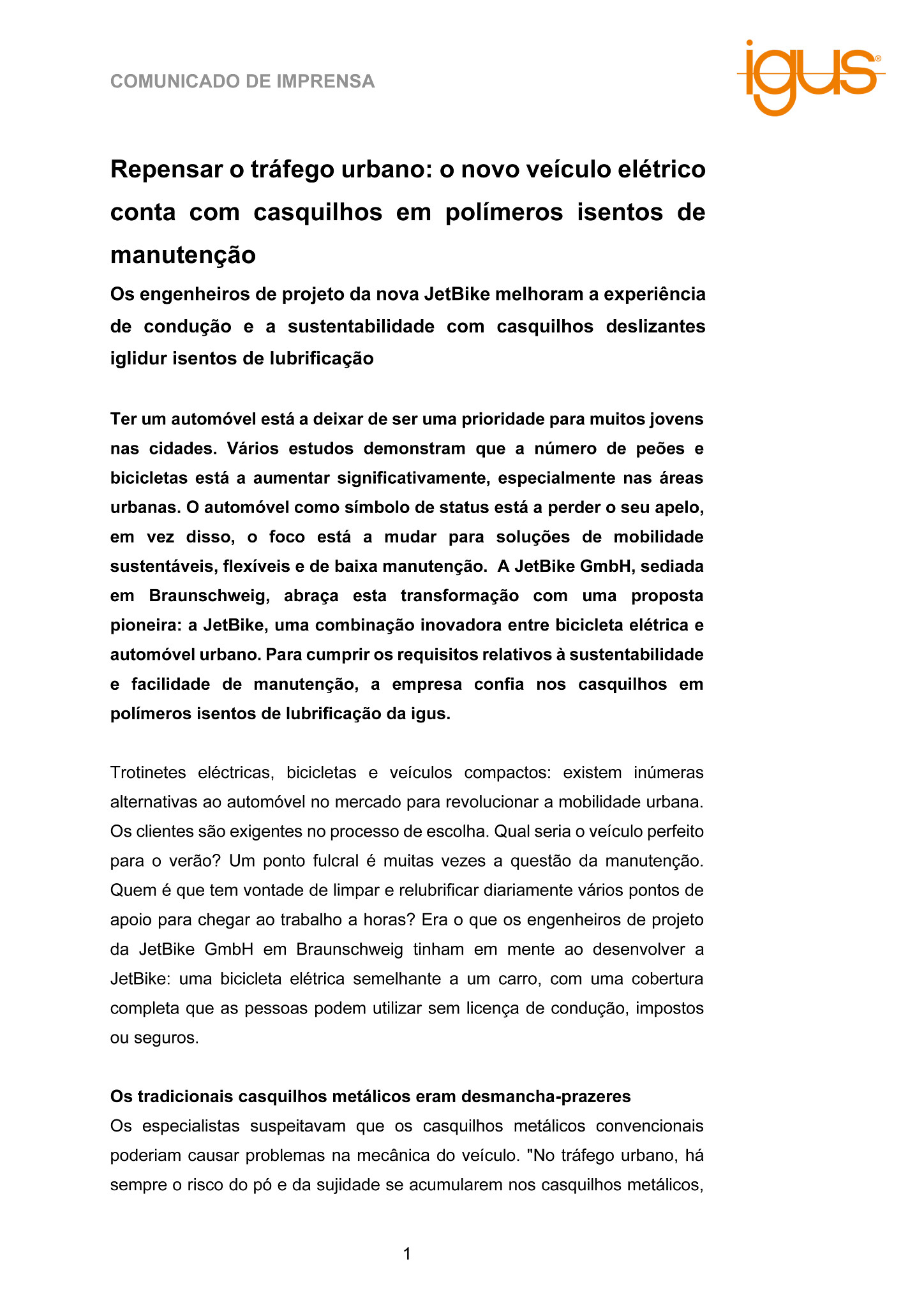 Ter um automóvel está a deixar de ser uma prioridade para muitos jovens nas cidades. Vários estudos demonstram que a número de peões e bicicletas está a aumentar significativamente, especialmente nas áreas urbanas. O automóvel como símbolo de status está a perder o seu apelo, em vez disso, o foco está a mudar para soluções de mobilidade sustentáveis, flexíveis e de baixa manutenção. A JetBike GmbH, sediada em Braunschweig, abraça esta transformação com uma proposta pioneira: a JetBike, uma combinação inovadora entre bicicleta elétrica e automóvel urbano. Para cumprir os requisitos relativos à sustentabilidade e facilidade de manutenção, a empresa confia nos casquilhos em polímeros isentos de lubrificação da igus.
