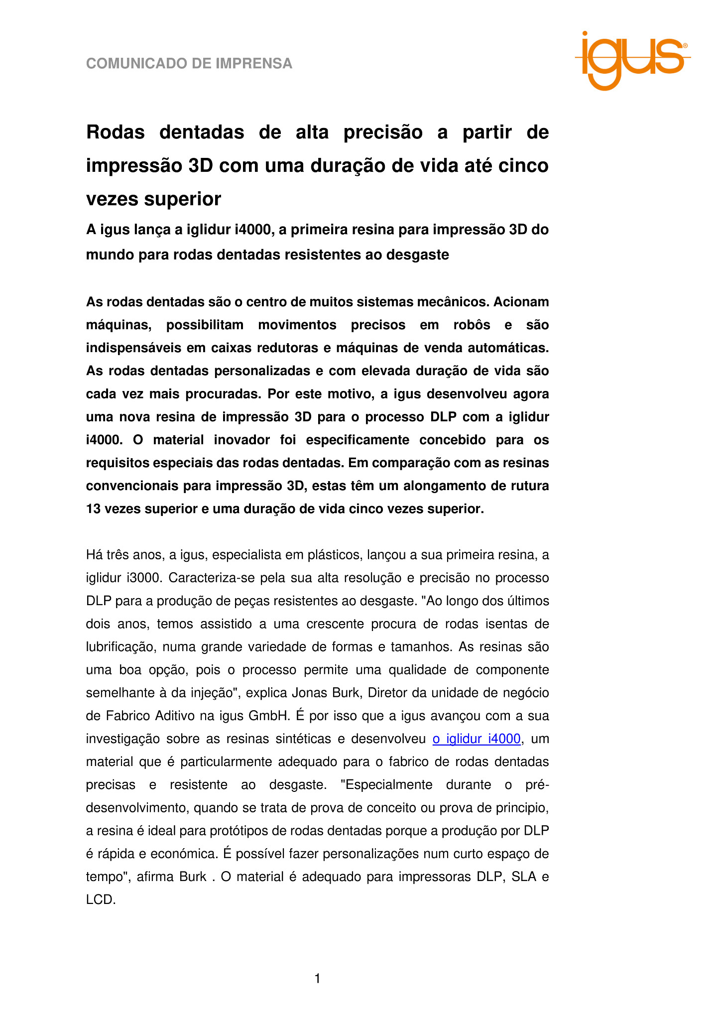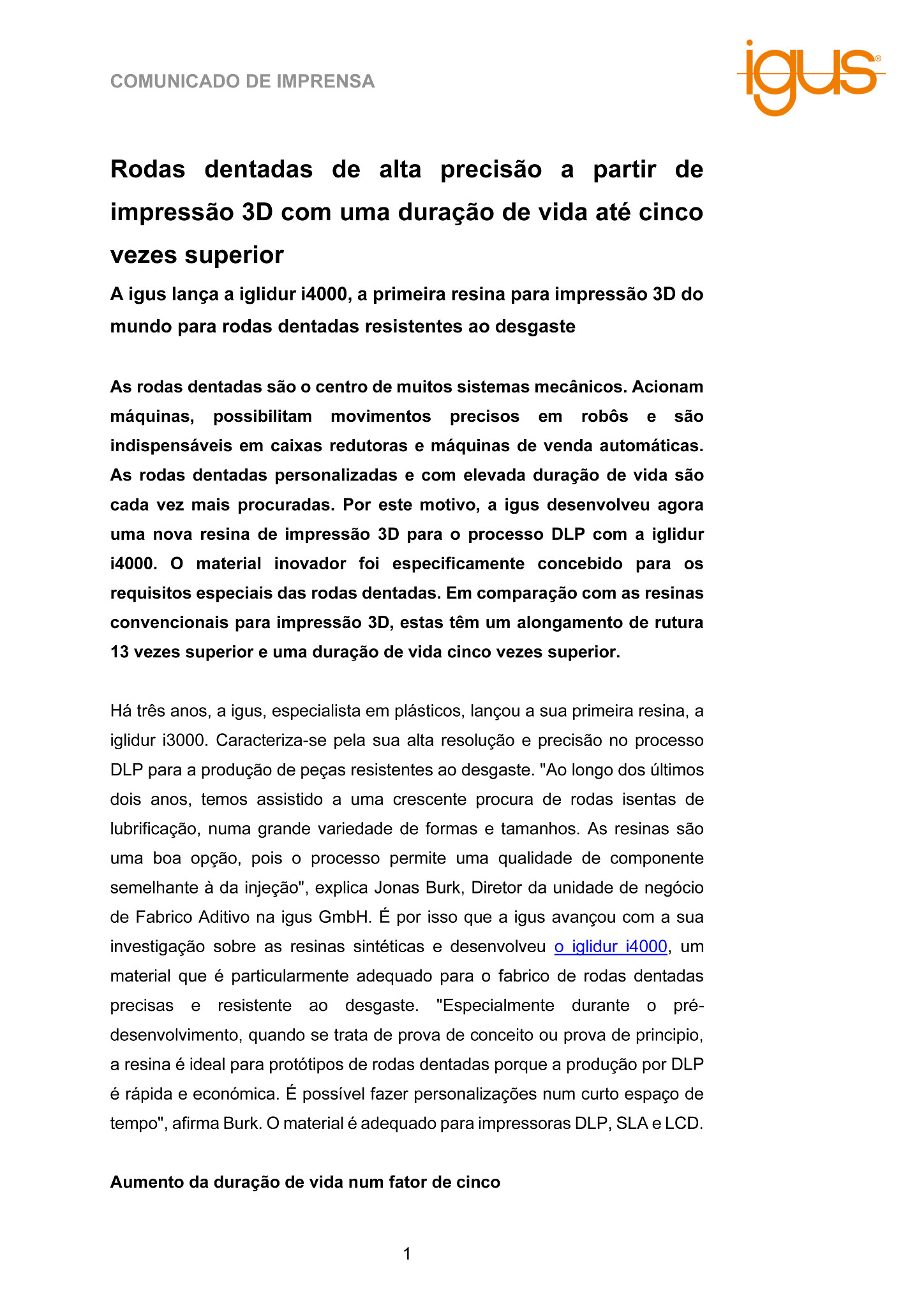 Há três anos, a igus, especialista em plásticos, lançou a sua primeira resina, a iglidur i3000. Caracteriza-se pela sua alta resolução e precisão no processo DLP para a produção de peças resistentes ao desgaste. “Ao longo dos últimos dois anos, temos assistido a uma crescente procura de rodas isentas de lubrificação, numa grande variedade de formas e tamanhos. As resinas são uma boa opção, pois o processo permite uma qualidade de componente semelhante à da injeção”, explica Jonas Burk, Diretor da unidade de negócio de Fabrico Aditivo na igus GmbH. É por isso que a igus avançou com a sua investigação sobre as resinas sintéticas e desenvolveu o iglidur i4000, um material que é particularmente adequado para o fabrico de rodas dentadas precisas e resistente ao desgaste. “Especialmente durante o pré-desenvolvimento, quando se trata de prova de conceito ou prova de principio, a resina é ideal para protótipos de rodas dentadas porque a produção por DLP é rápida e económica. É possível fazer personalizações num curto espaço de tempo”, afirma Burk. O material é adequado para impressoras DLP, SLA e LCD.