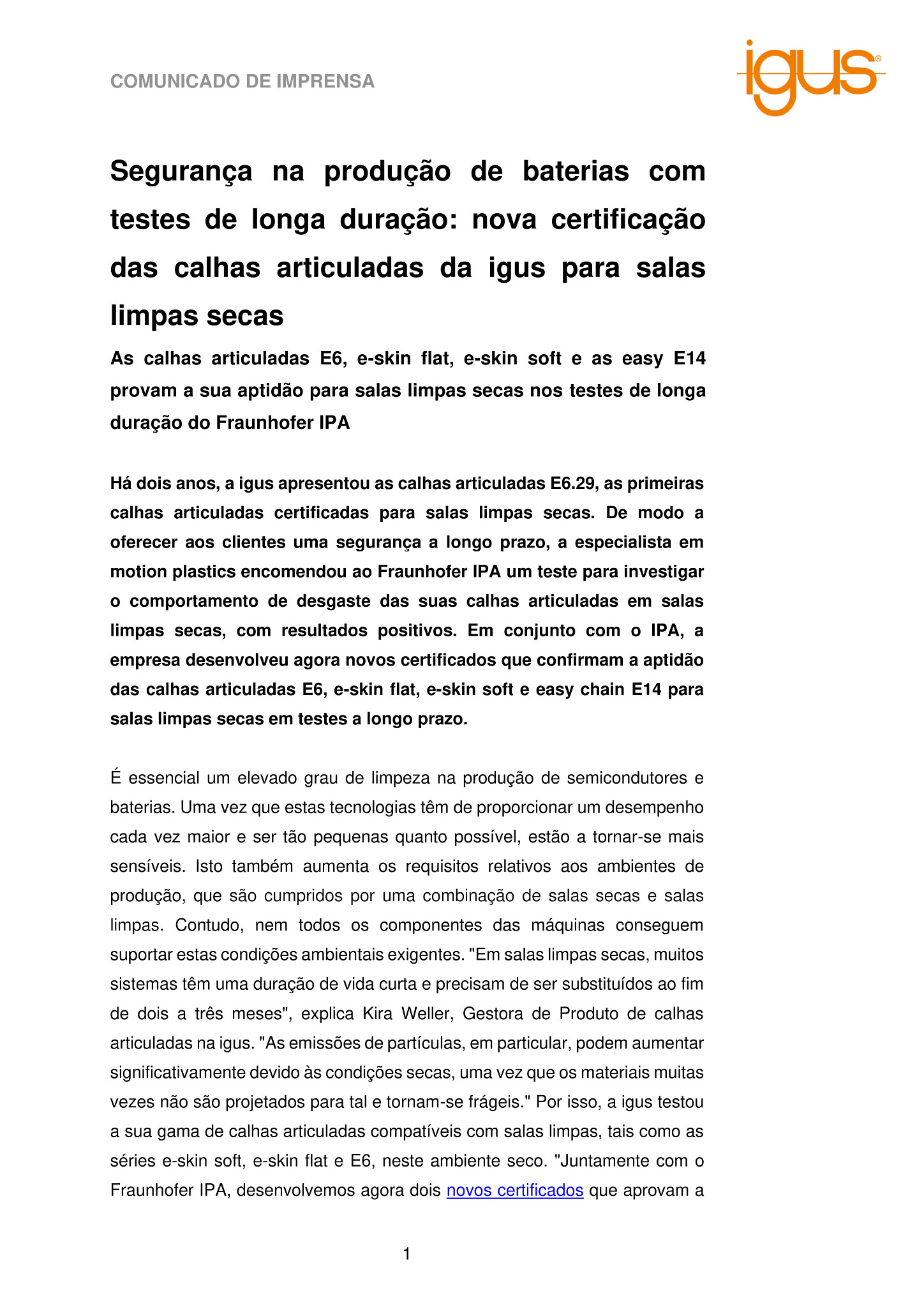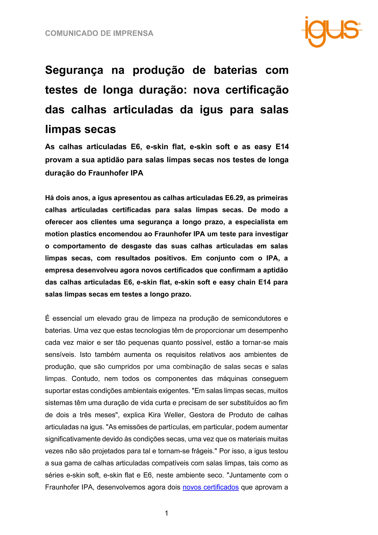 Há dois anos, a igus apresentou as calhas articuladas E6.29, as primeiras calhas articuladas certificadas para salas limpas secas. De modo a oferecer aos clientes uma segurança a longo prazo, a especialista em motion plastics encomendou ao Fraunhofer IPA um teste para investigar o comportamento de desgaste das suas calhas articuladas em salas limpas secas, com resultados positivos. Em conjunto com o IPA, a empresa desenvolveu agora novos certificados que confirmam a aptidão das calhas articuladas E6, e-skin flat, e-skin soft e easy chain E14 para salas limpas secas em testes a longo prazo.
