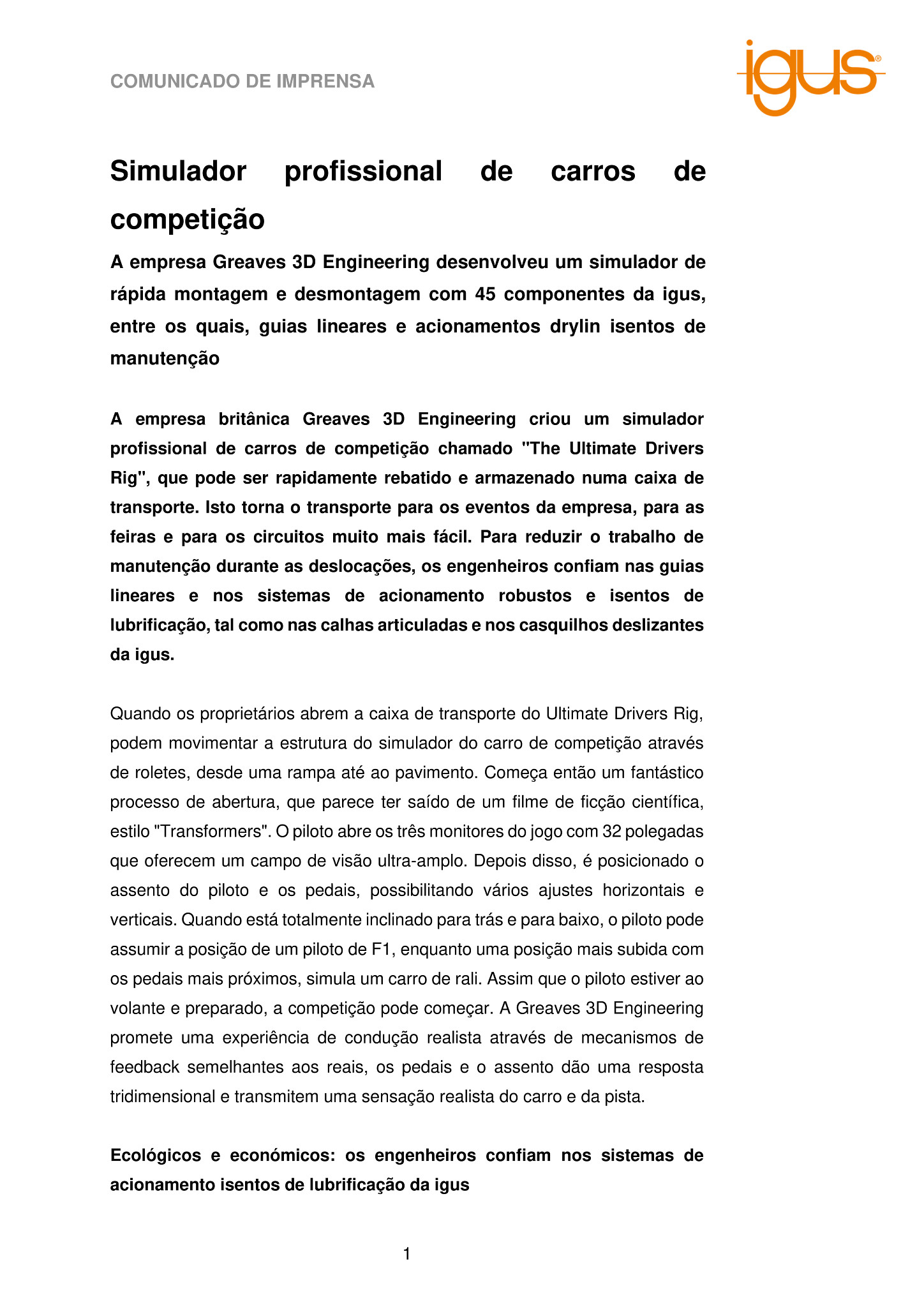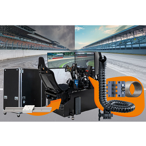 A empresa britânica Greaves 3D Engineering criou um simulador profissional de carros de competição chamado “The Ultimate Drivers Rig”, que pode ser rapidamente rebatido e armazenado numa caixa de transporte. Isto torna o transporte para os eventos da empresa, para as feiras e para os circuitos muito mais fácil. Para reduzir o trabalho de manutenção durante as deslocações, os engenheiros confiam nas guias lineares e nos sistemas de acionamento robustos e isentos de lubrificação, tal como nas calhas articuladas e nos casquilhos deslizantes da igus.