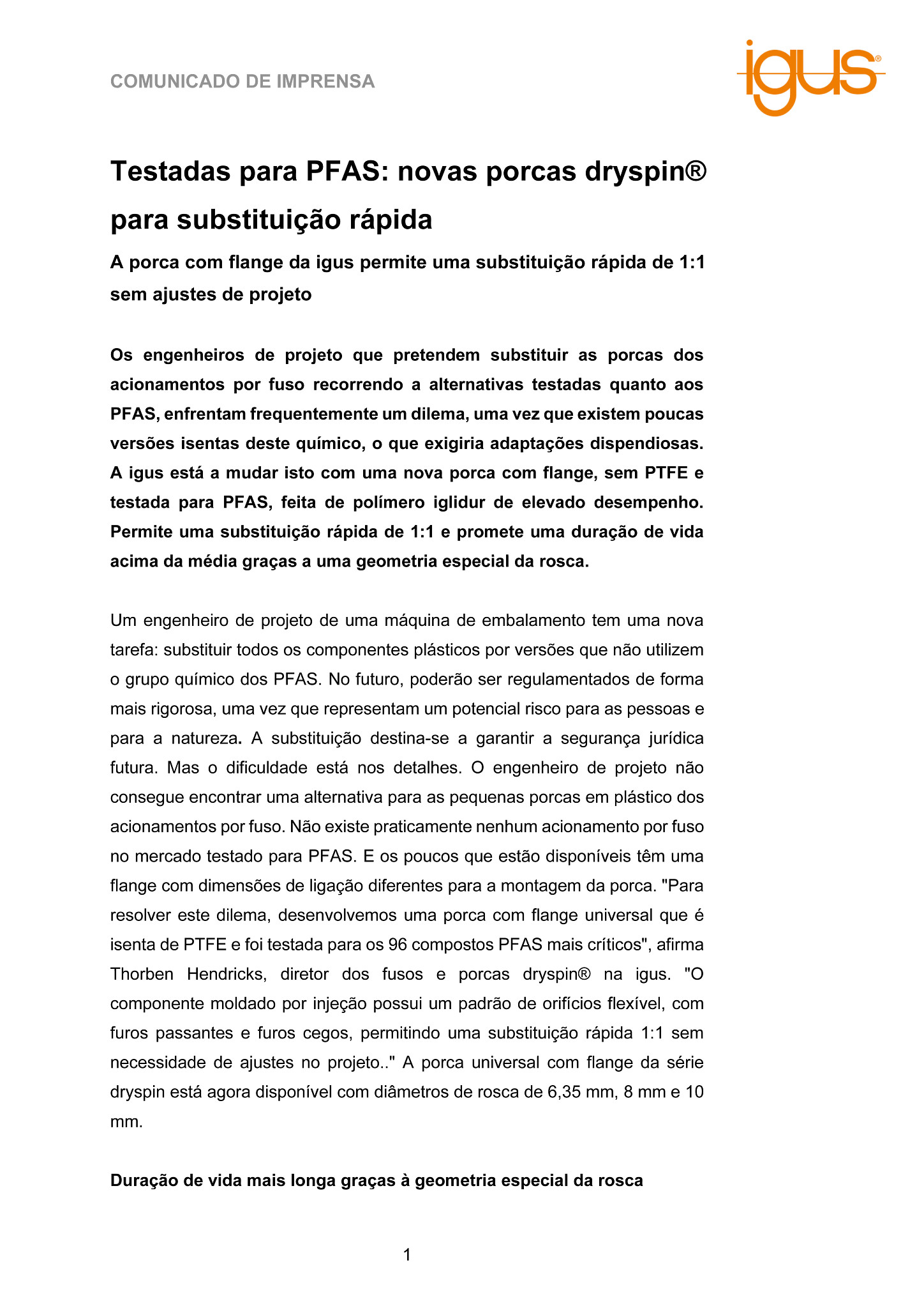 Um engenheiro de projeto de uma máquina de embalamento tem uma nova tarefa: substituir todos os componentes plásticos por versões que não utilizem o grupo químico dos PFAS. No futuro, poderão ser regulamentados de forma mais rigorosa, uma vez que representam um potencial risco para as pessoas e para a natureza. A substituição destina-se a garantir a segurança jurídica futura. Mas o dificuldade está nos detalhes. O engenheiro de projeto não consegue encontrar uma alternativa para as pequenas porcas em plástico dos acionamentos por fuso. Não existe praticamente nenhum acionamento por fuso no mercado testado para PFAS. E os poucos que estão disponíveis têm uma flange com dimensões de ligação diferentes para a montagem da porca. “Para resolver este dilema, desenvolvemos uma porca com flange universal que é isenta de PTFE e foi testada para os 96 compostos PFAS mais críticos”, afirma Thorben Hendricks, diretor dos fusos e porcas dryspin® na igus. “O componente moldado por injeção possui um padrão de orifícios flexível, com furos passantes e furos cegos, permitindo uma substituição rápida 1:1 sem necessidade de ajustes no projeto..” A porca universal com flange da série dryspin está agora disponível com diâmetros de rosca de 6,35 mm, 8 mm e 10 mm.