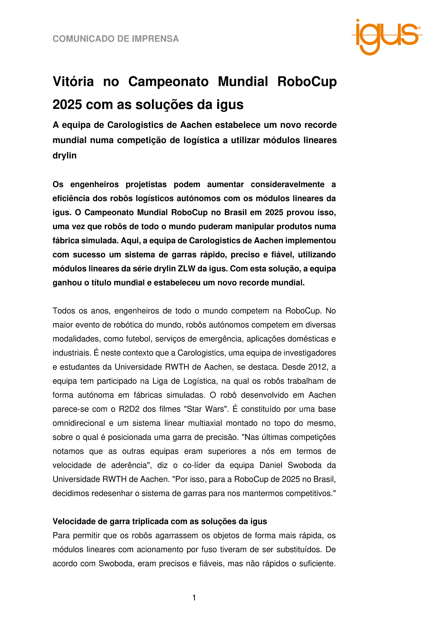 Os engenheiros projetistas podem aumentar consideravelmente a eficiência dos robôs logísticos autónomos com os módulos lineares da igus. O Campeonato Mundial RoboCup no Brasil em 2025 provou isso, uma vez que robôs de todo o mundo puderam manipular produtos numa fábrica simulada. Aqui, a equipa de Carologistics de Aachen implementou com sucesso um sistema de garras rápido, preciso e fiável, utilizando módulos lineares da série drylin ZLW da igus. Com esta solução, a equipa ganhou o título mundial e estabeleceu um novo recorde mundial.