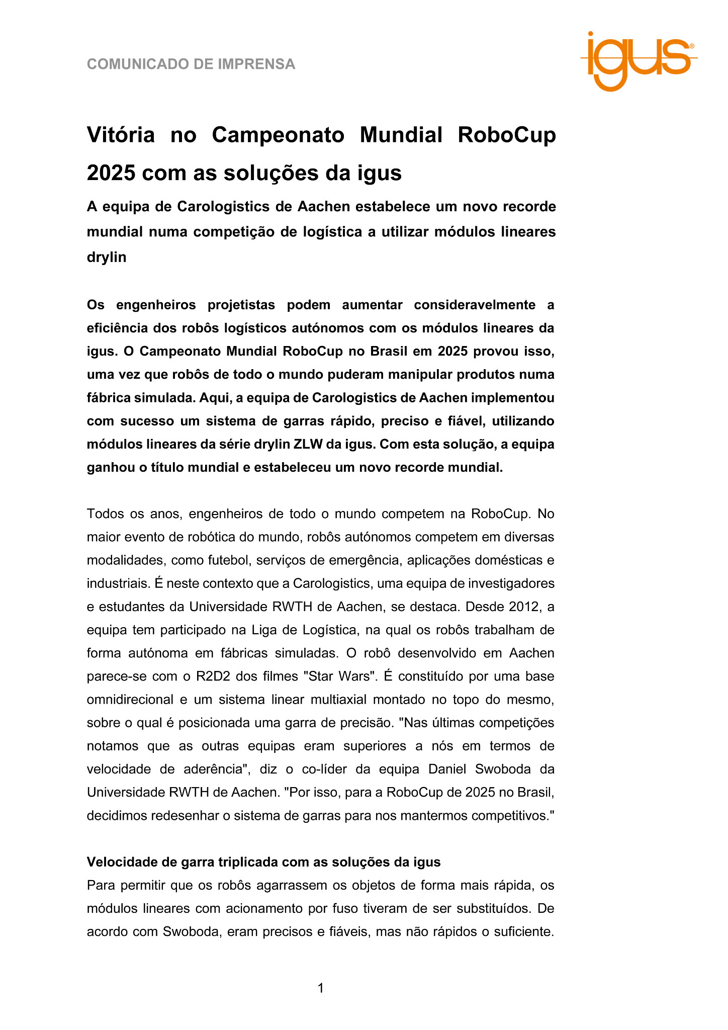 Levando consigo os robôs optimizados, a equipa viajou para Salvador, no Brasil, de 15 a 21 de julho de 2025. De acordo com Swoboda, um ponto positivo do sistema linear era o facto de não necessitar de lubrificação, o que significava que o transporte era higiénico. As competições começaram no local. A tarefa do robô era fabricar cilindros em vários tamanhos em máquinas de produção num ambiente fabril simulado, de acordo com encomendas aleatórias de clientes numa loja online. Para isso, o robô tem de planear etapas de trabalho e transportar continuamente componentes de uma máquina para outra. São necessários cerca de 40 movimentos de preensão por competição. “O sistema linear da igus não só impressionou pela sua velocidade e precisão, mas também pela sua elevada fiabilidade”, diz Swoboda. O sistema teria dado assim um contributo importante para garantirem o novo recorde mundial. “Conseguimos fabricar oito em dez produtos encomendados na loja online durante o concurso.” O que corresponde a mais dois produtos do que o recorde anterior estabelecido pela Universidade de Tecnologia de Graz. “Gostaríamos de agradecer à igus, que nos apoiou em todas as etapas como patrocinadores, com tecnologia de ponta e conhecimentos valiosos.”